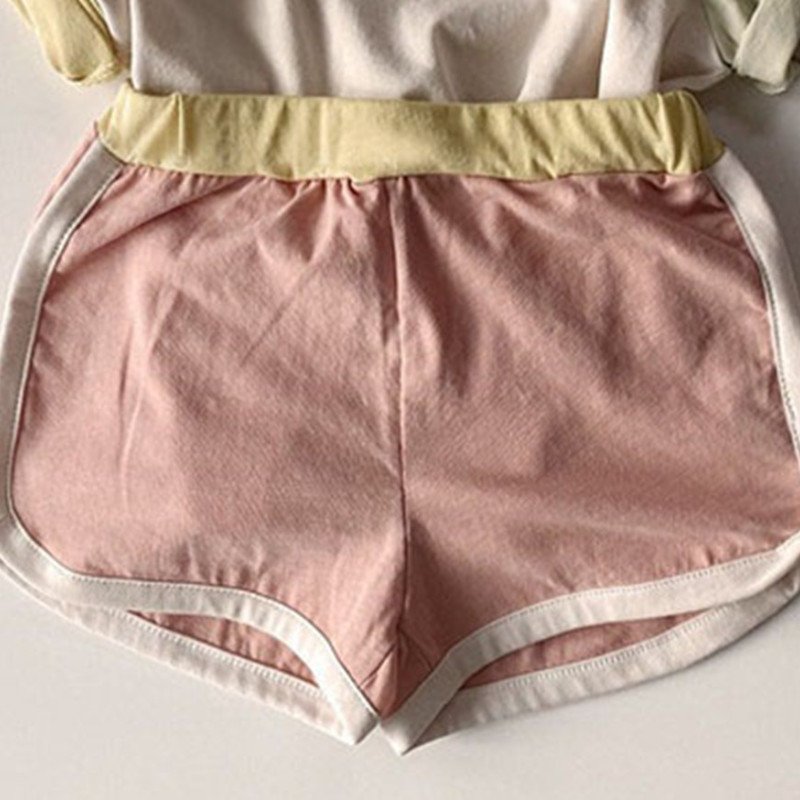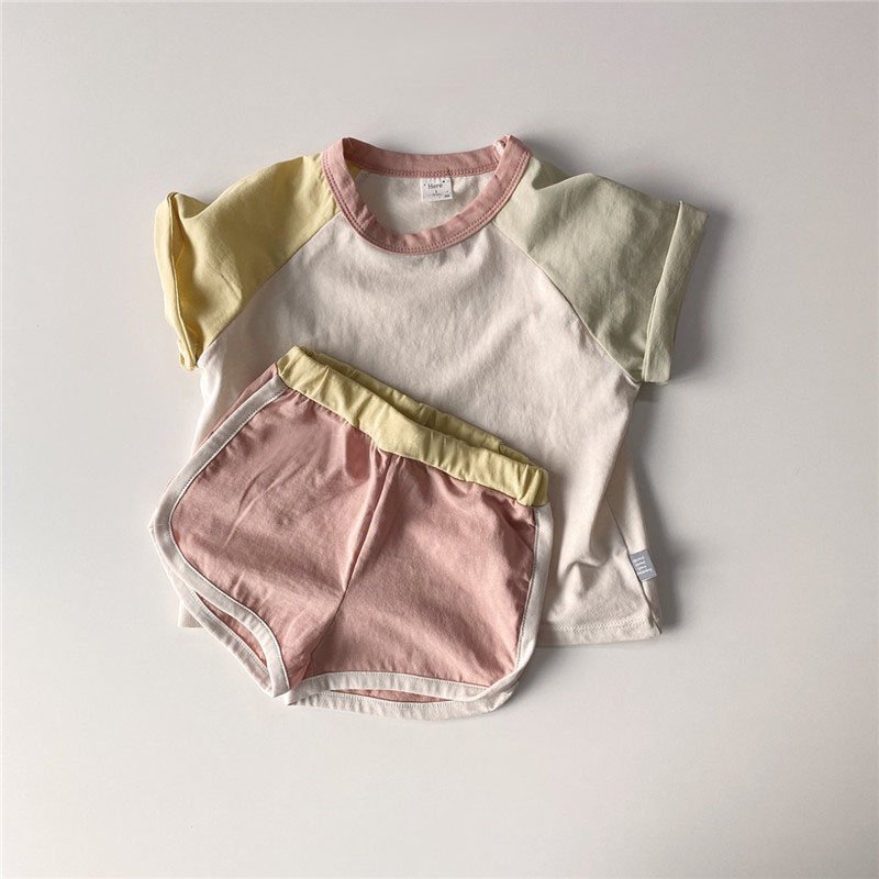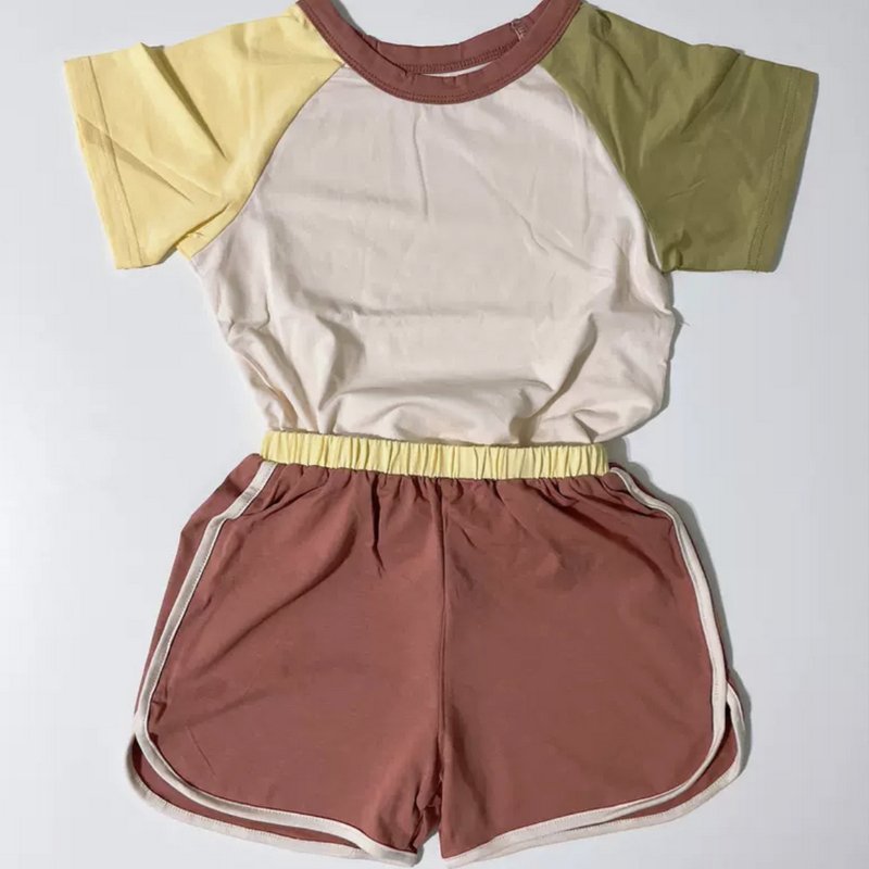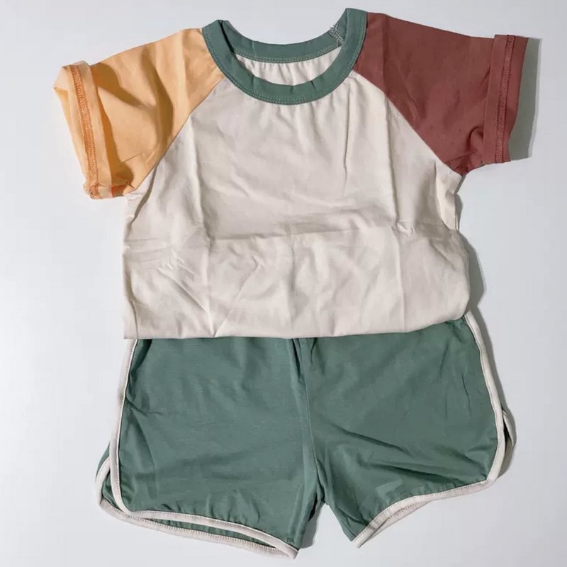 Kids Casual Round Neck Short Sleeve Color Blocking Loose T-Shirt And Elastic Shorts Set