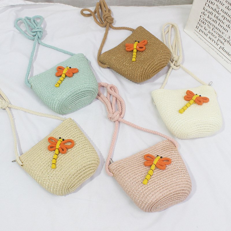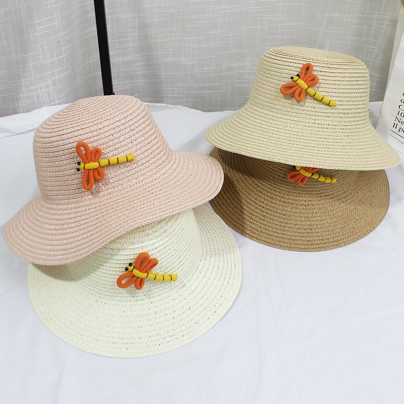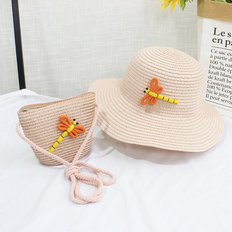 Kids Fashion Beach Shade Sunscreen Straw Hat Dragonfly Straw Bag Set