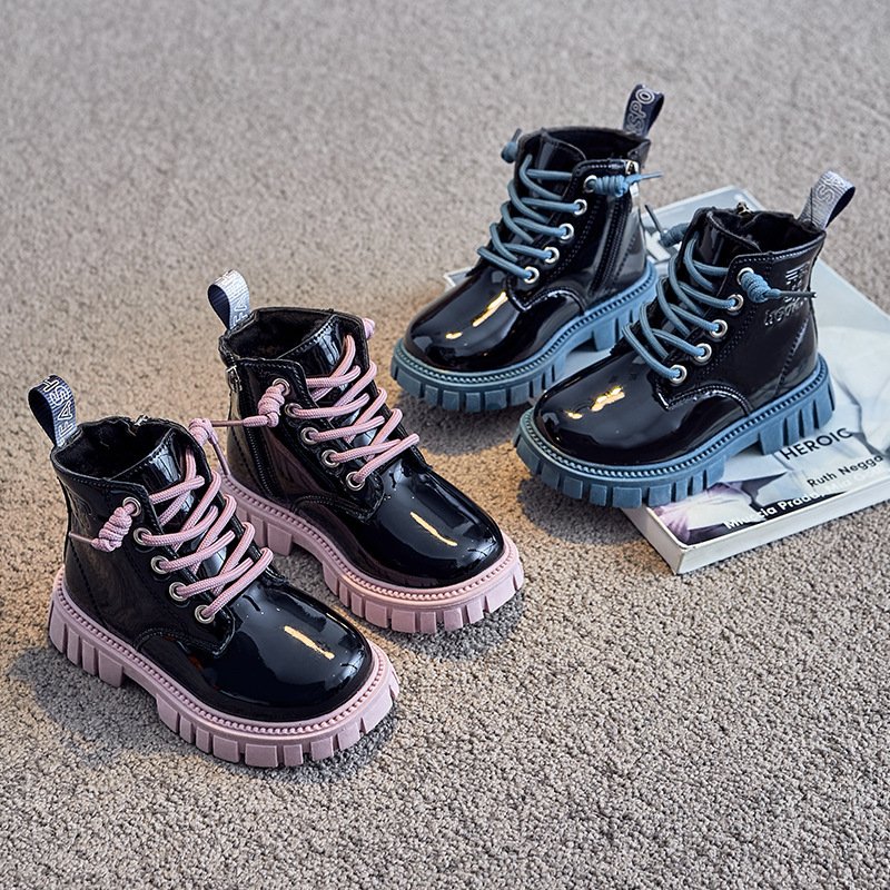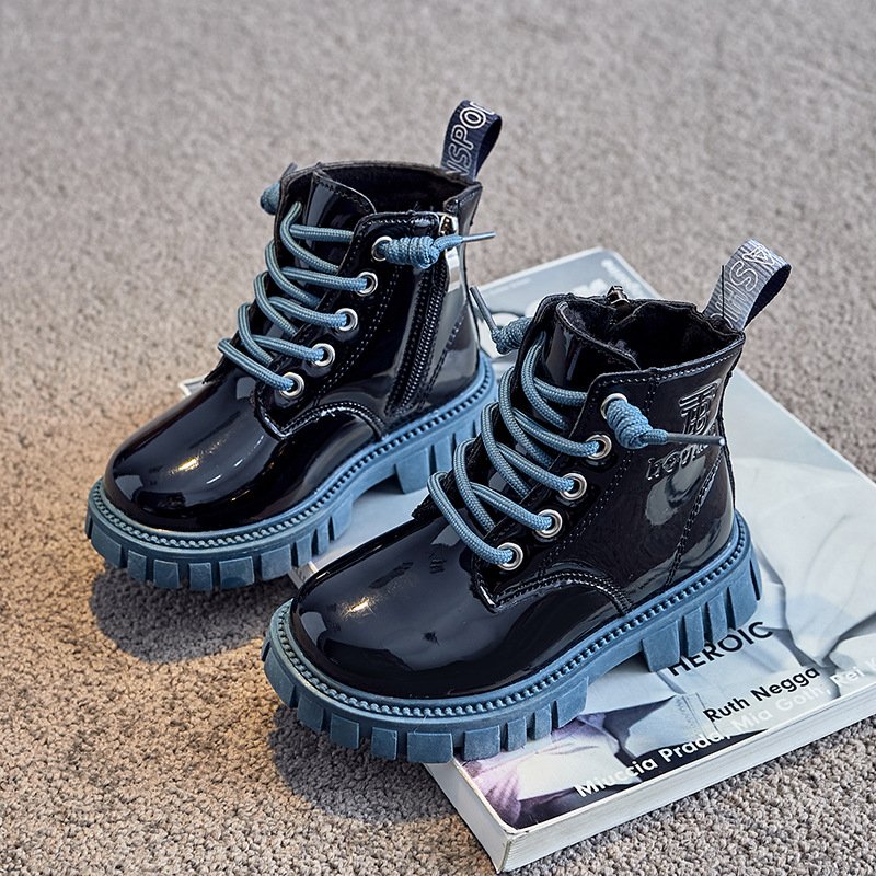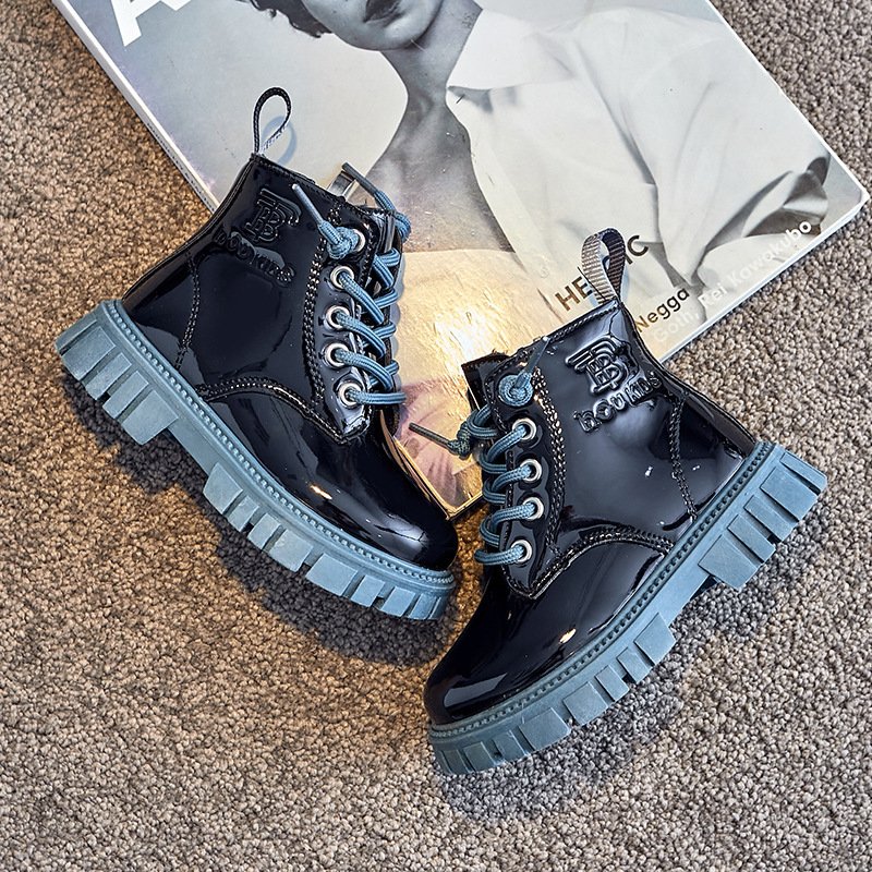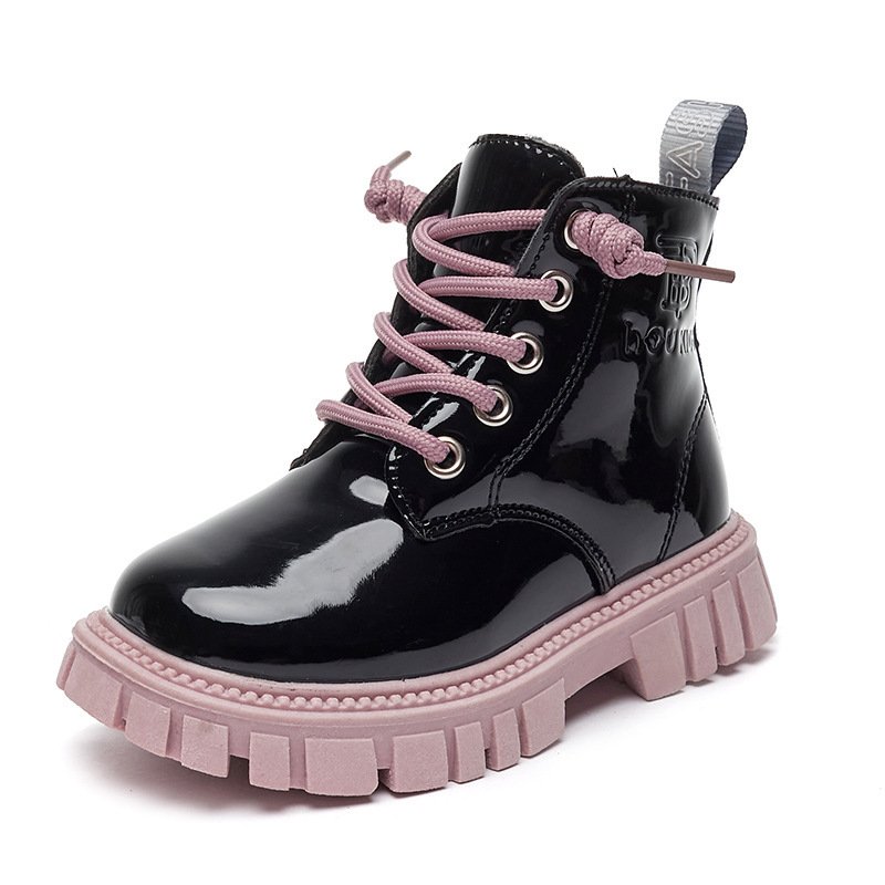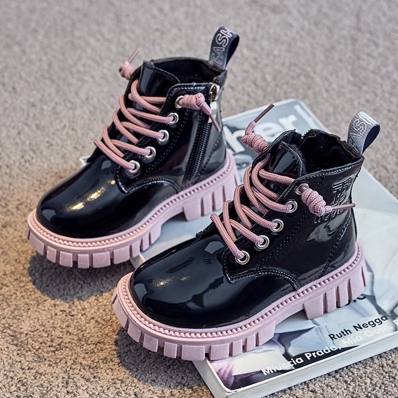 Kids Fashion Lace Up Color-soled Bright PU Fleece-lined Warm Short Boots