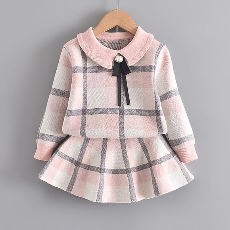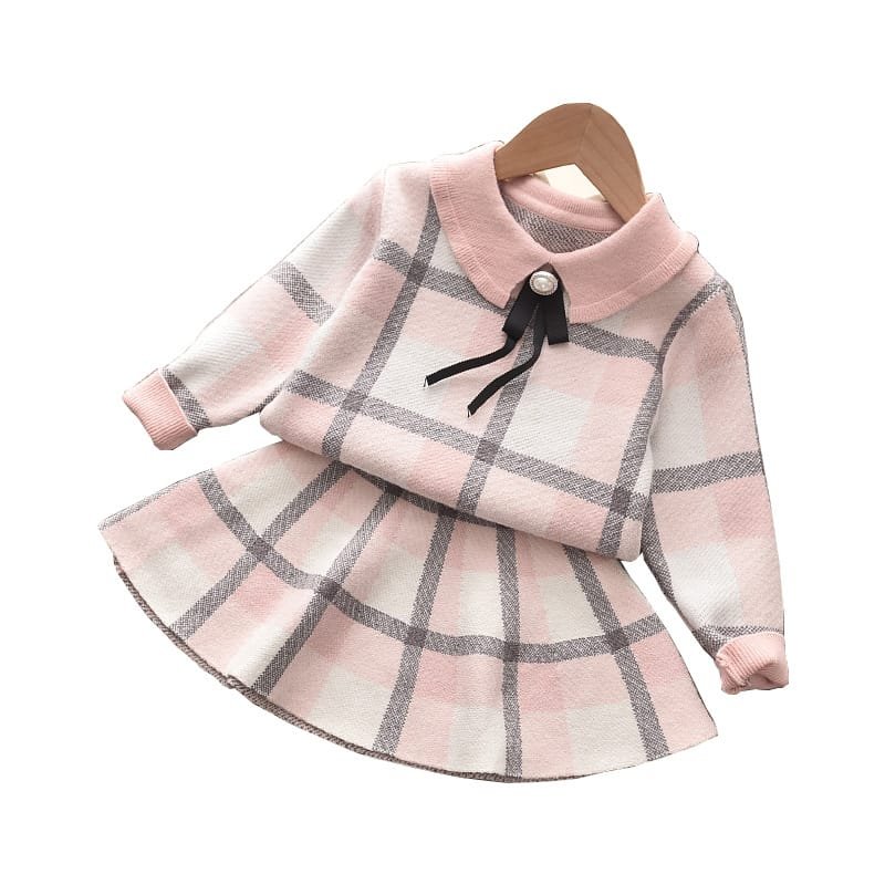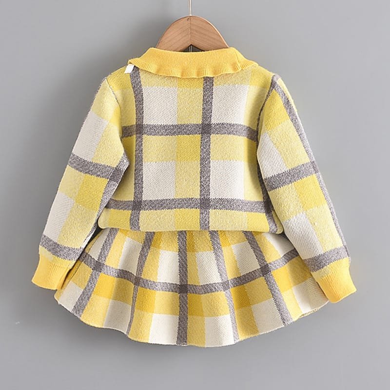 Kids Fashion Lapel Design Tops And Plaid Skirt Set