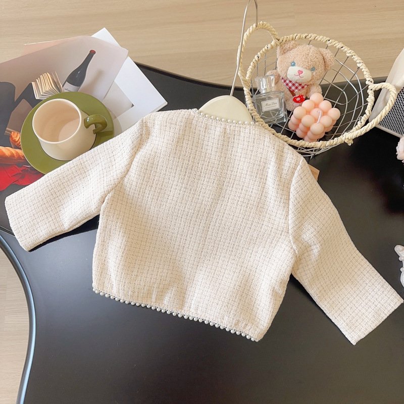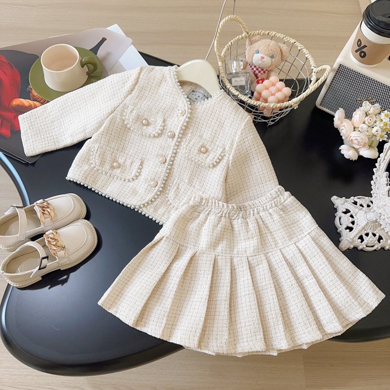 Kids Girl Autumn Fashion Elegant Plaid Pearl Decoration Long-Sleeve Coat Pleated Skirt Two-Piece Set