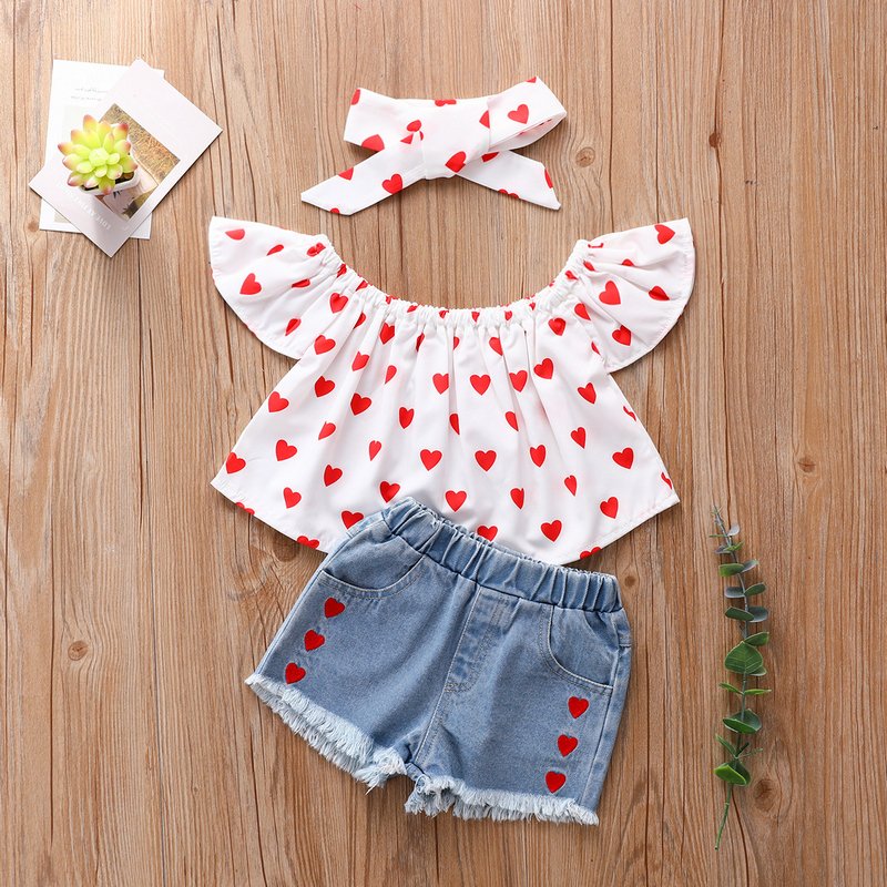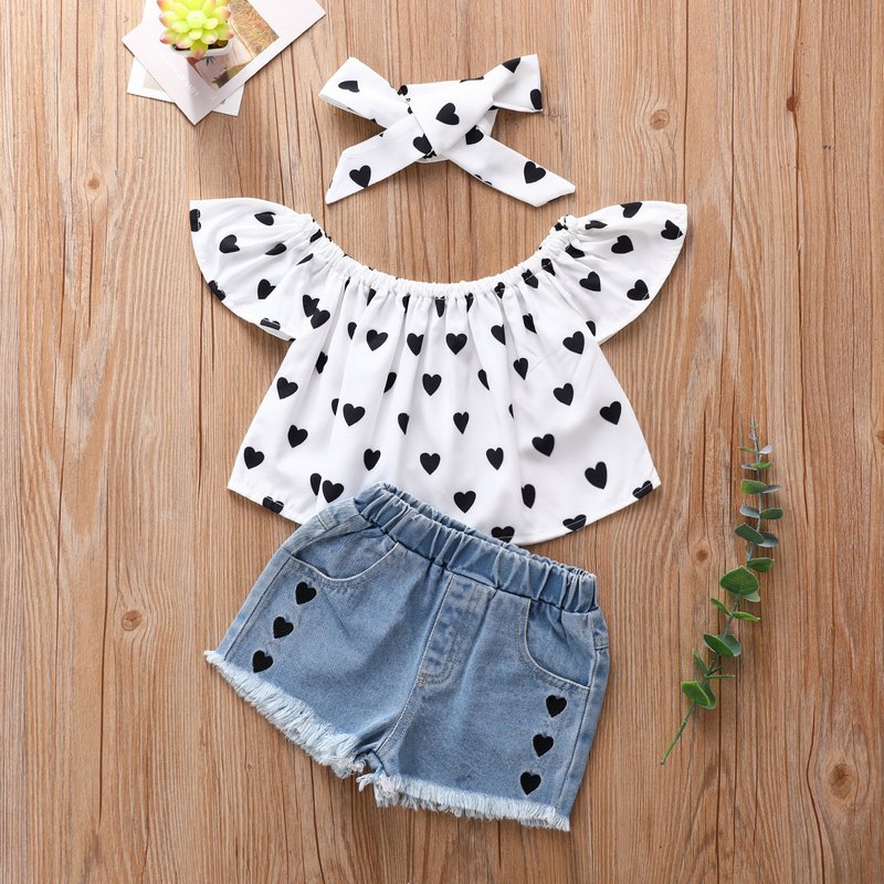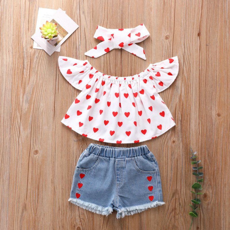 Kids Girls Basic Heart Off-the-shoulder Top And Elastic Waist Denim Shorts With Headband Set
