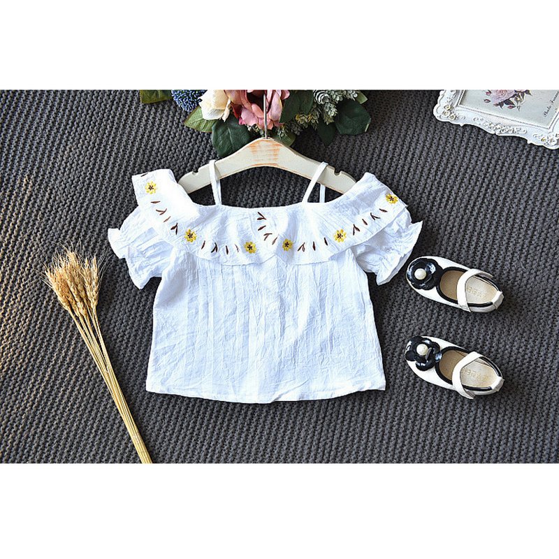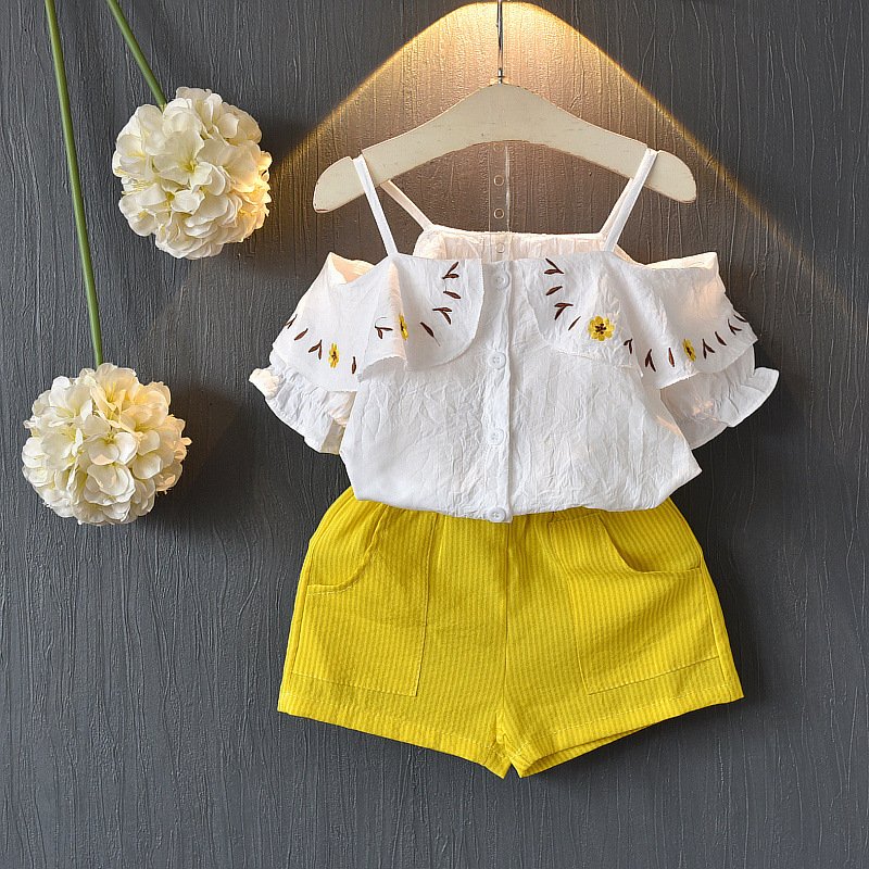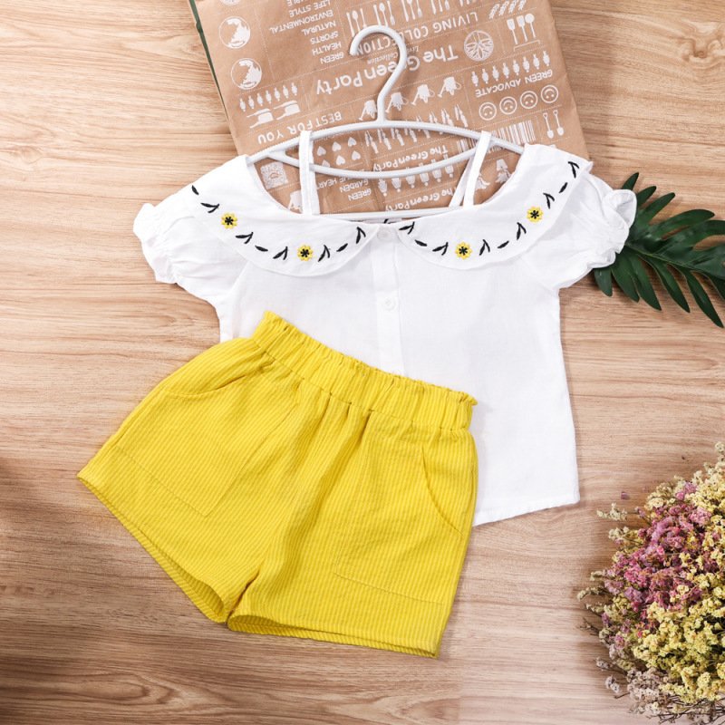 Kids Girls Basic Off-the-shoulder Embroidered Single-breasted Short-sleeved Blouse And Elastic Waist Shorts Two-piece Set