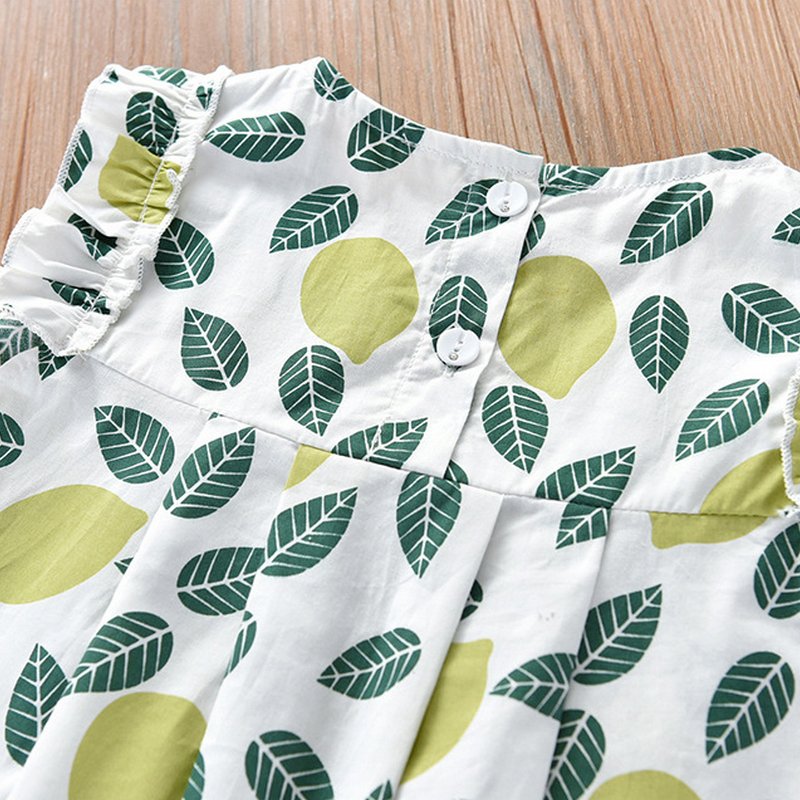Kids Girls Basic Round Neck Sleeveless Leaf Pattern Stringy Selvedge T-Shirt And Elastic Shorts Set