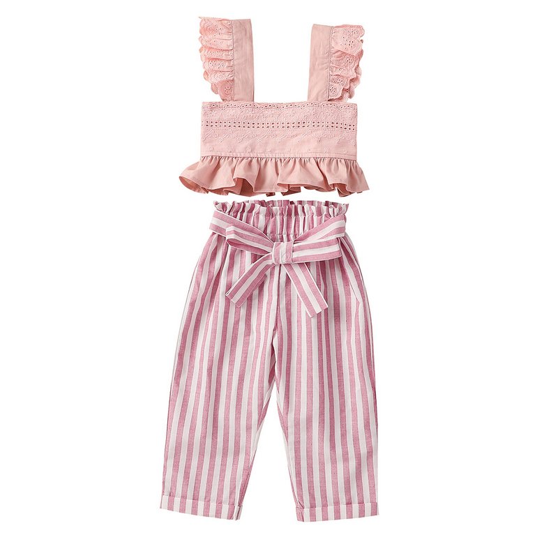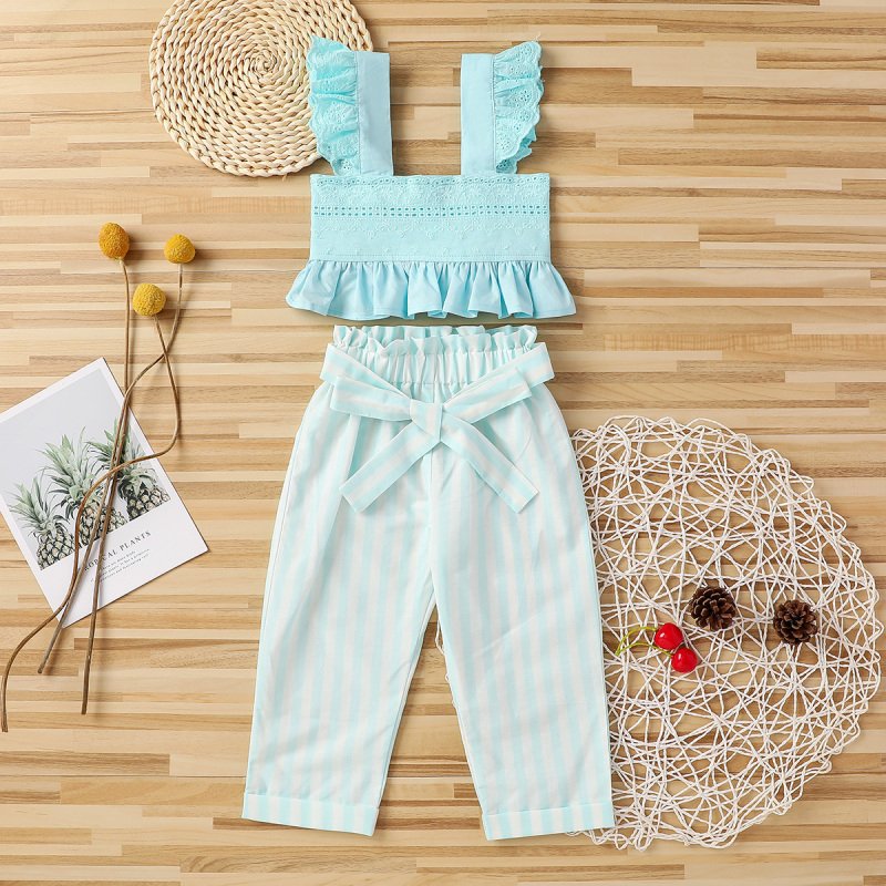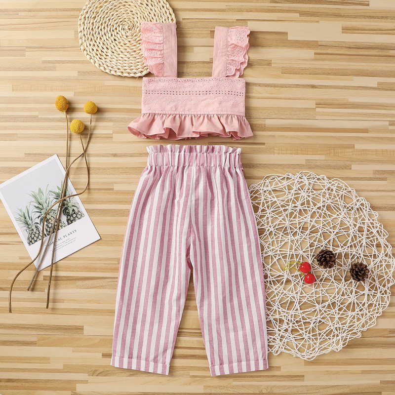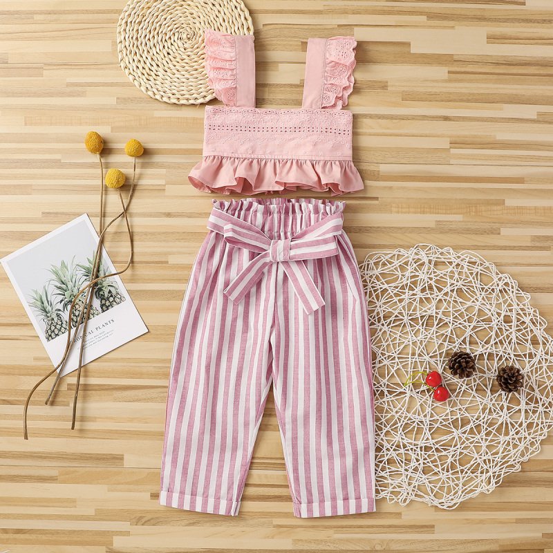Kids Girls Basic Ruffled Lace Camisole And Elastic Striped Long Pants Set