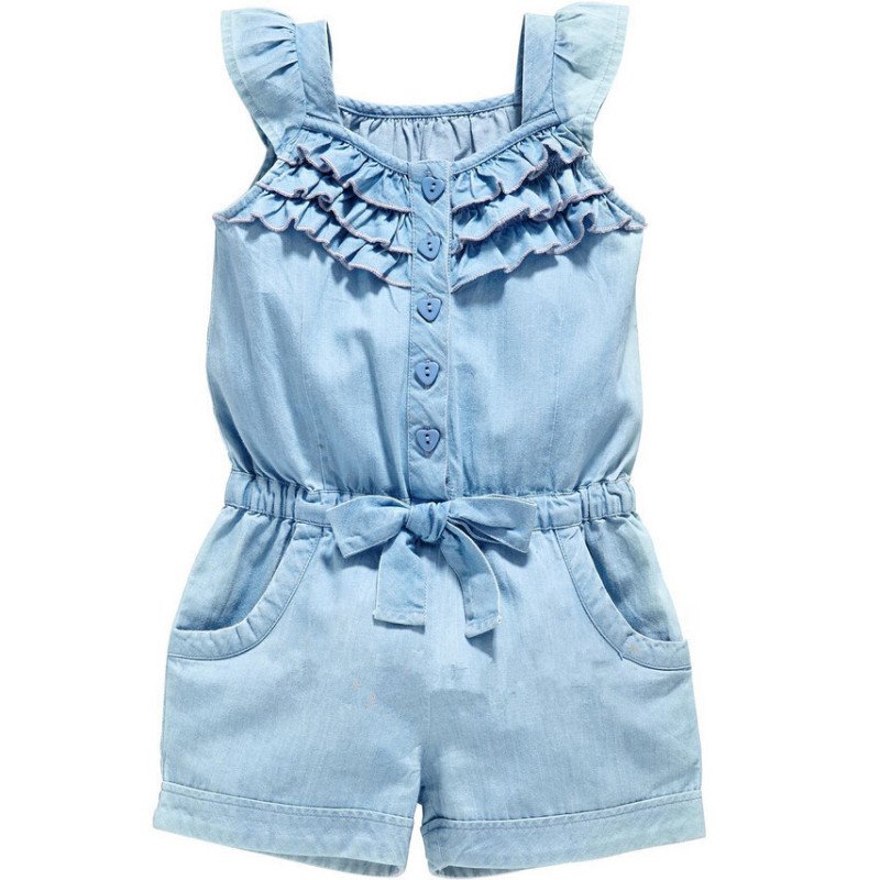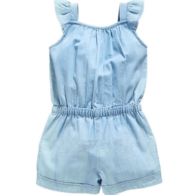 Kids Girls Basic Ruffled Solid Color Denim Flying Sleeves Bow Elastic Romper