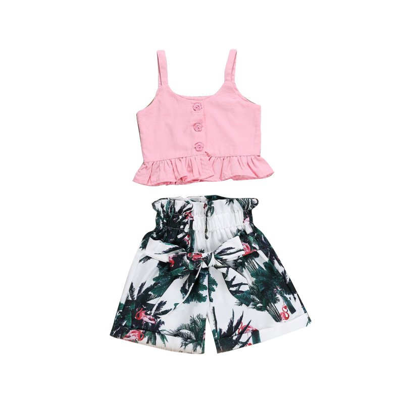 Kids Girls Basic Ruffled Vest Crop Top And Flamingo Plant Shorts Set