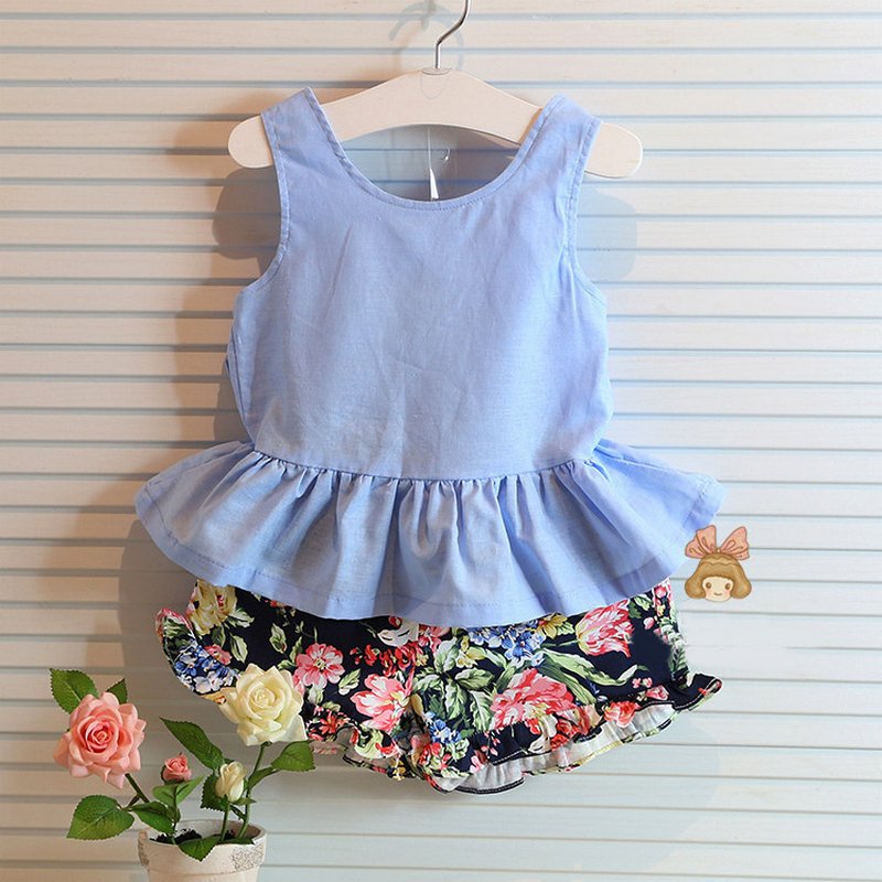 Kids Girls Basic Solid Color Ruffled Top And Flower Pattern Shorts Set