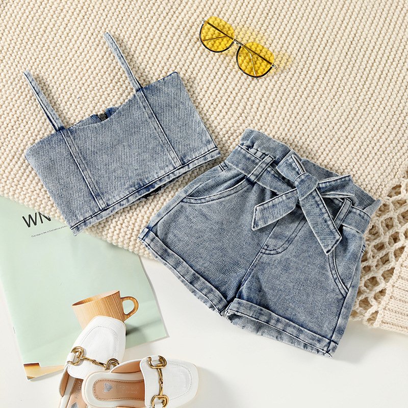 Kids Girls Basic Solid Color Slip Camisole And Denim Shorts With Belt