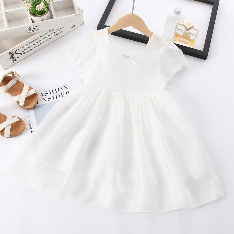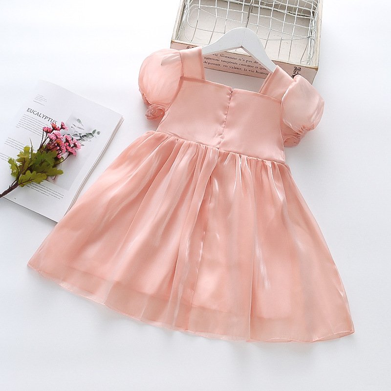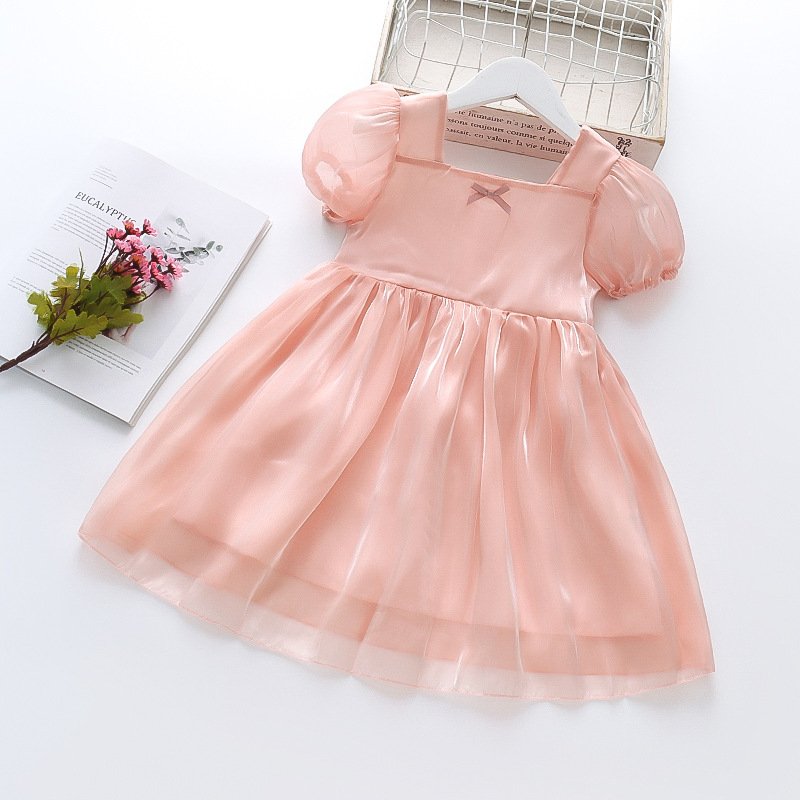 Kids Girls Basic Solid Color Square Neck Puff Sleeve Shiny Smooth Dress
