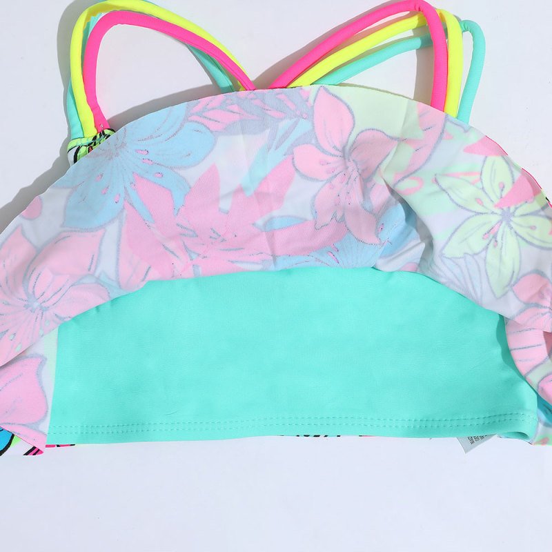 Kids Girls Basic Tropical Flower All Over Print Crochet Strap Top And Bottom Bikini Set