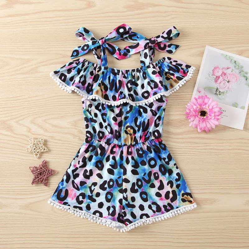 Kids Girls Bohemia Tie-dye Leopard All Over Print Ruffled Sleeveless Romper