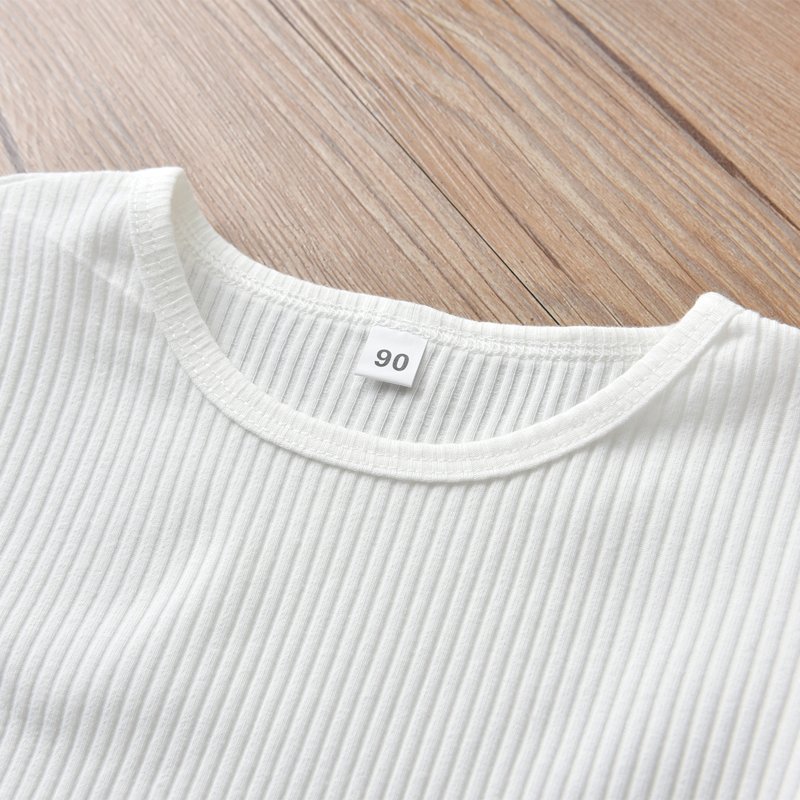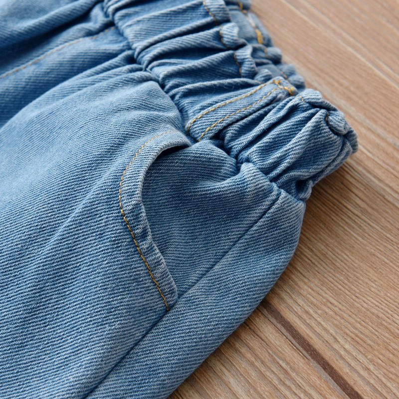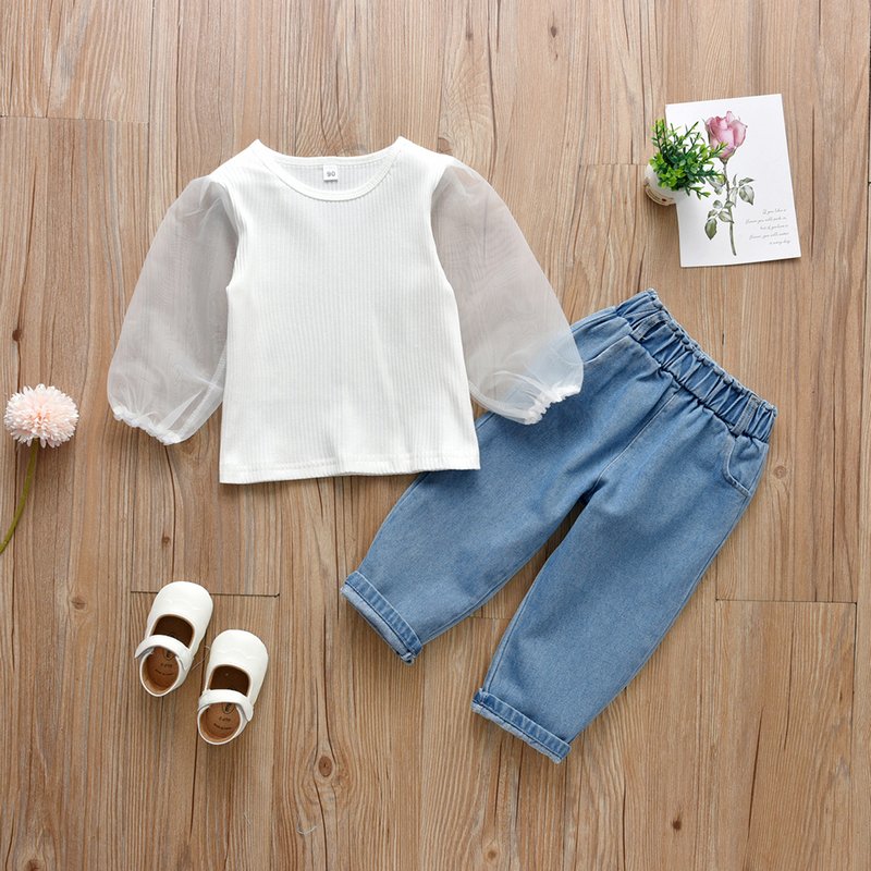Kids Girls Casual Mesh Long Puff Sleeve Knit Top And Elastic Denim Pants Set
