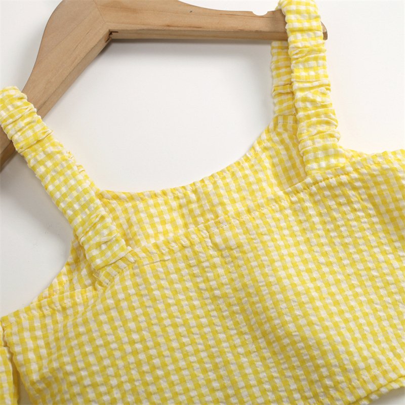 Kids Girls Casual Plaid Off-the-shoulder Puff Sleeve Blouse And Hole Design Spliced Denim Shorts Set