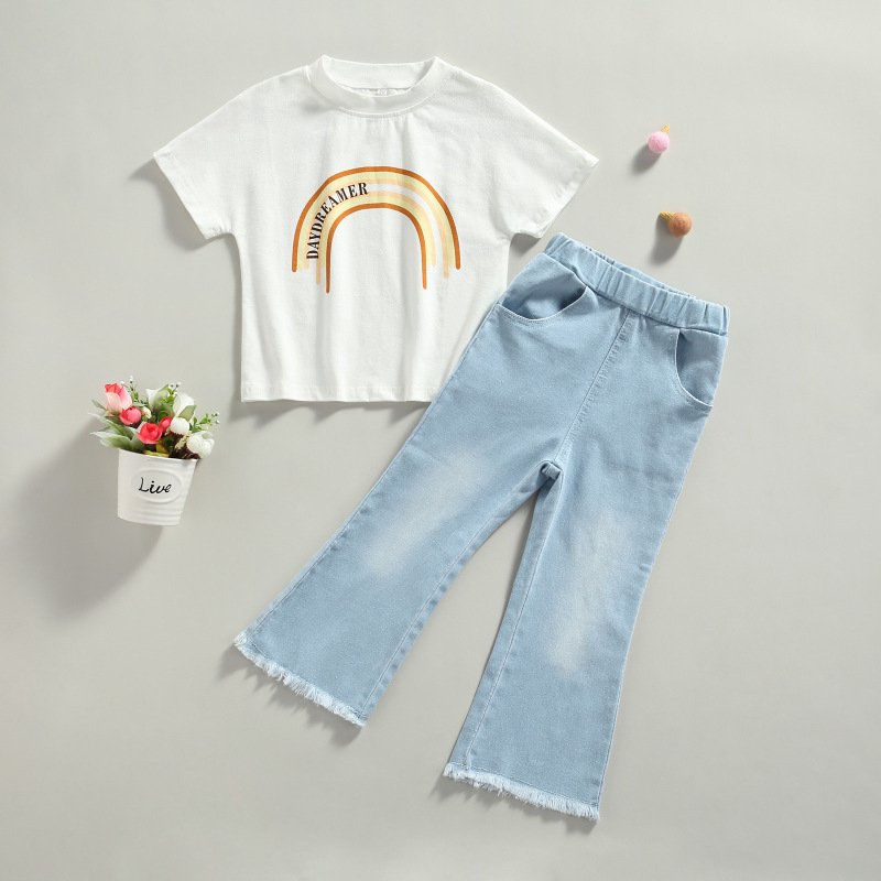 Kids Girls Casual Rainbow Print Round Neck Short Sleeve Loose T-Shirt And Elastic Waist Denim Flared Trousers Two-piece Set