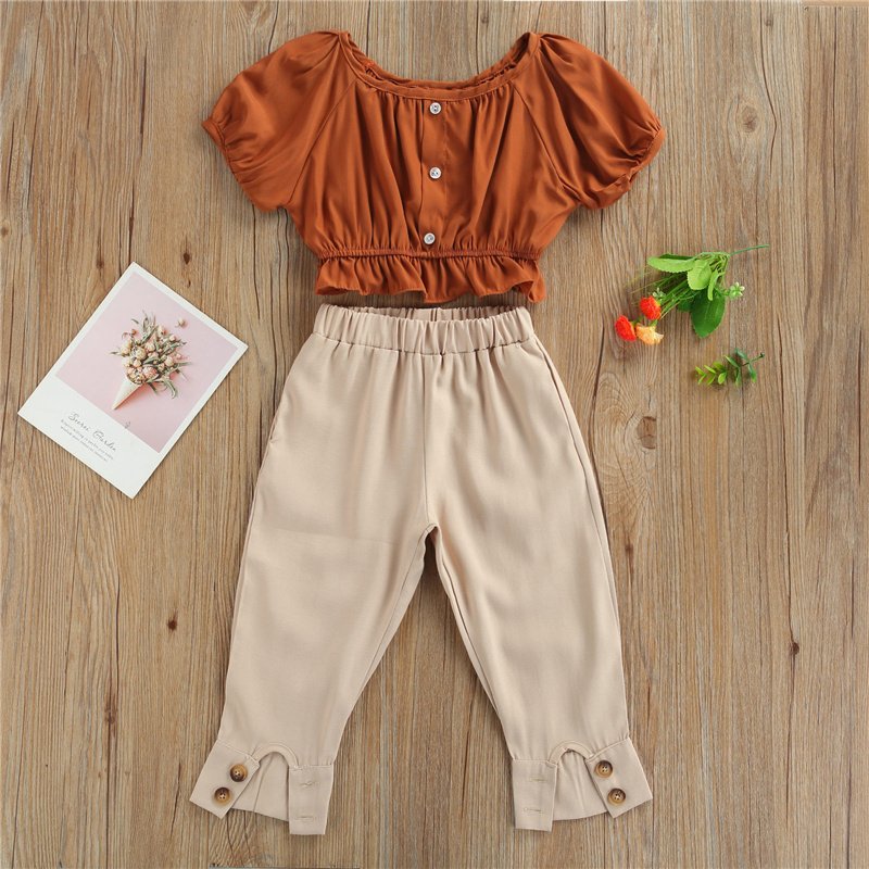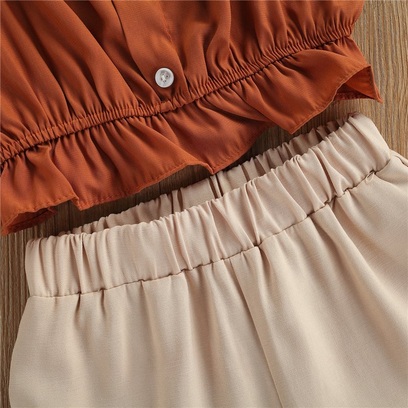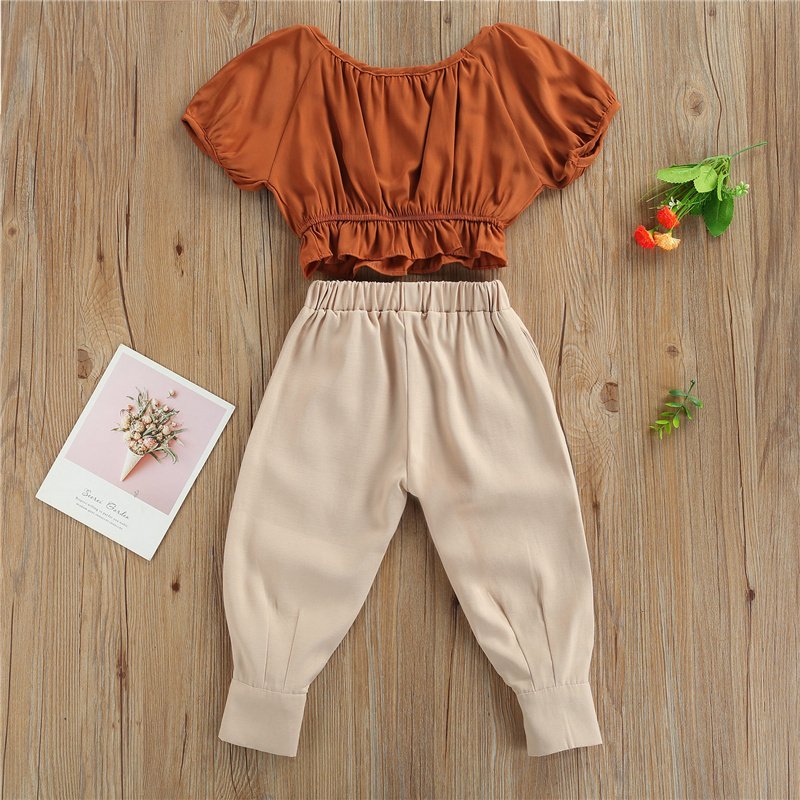Kids Girls Casual Round Neck Short Sleeve Solid Color Ruffled T-Shirt And Pants Set