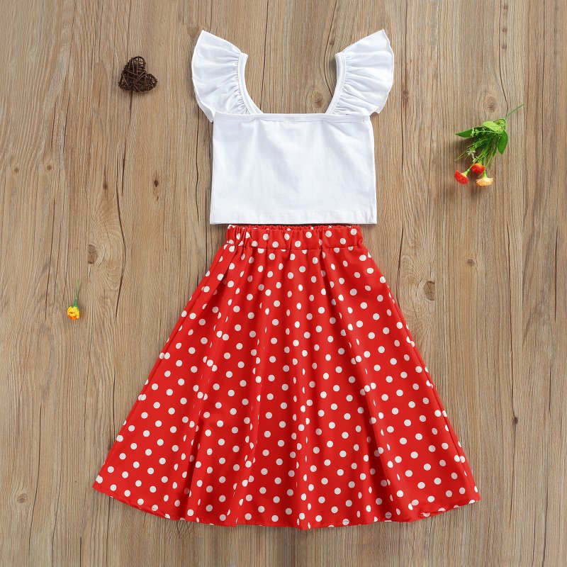 Kids Girls Casual Ruffled Solid Color Sleeveless Strap Cropped Top And Polka Dot Print Long Skirt Set