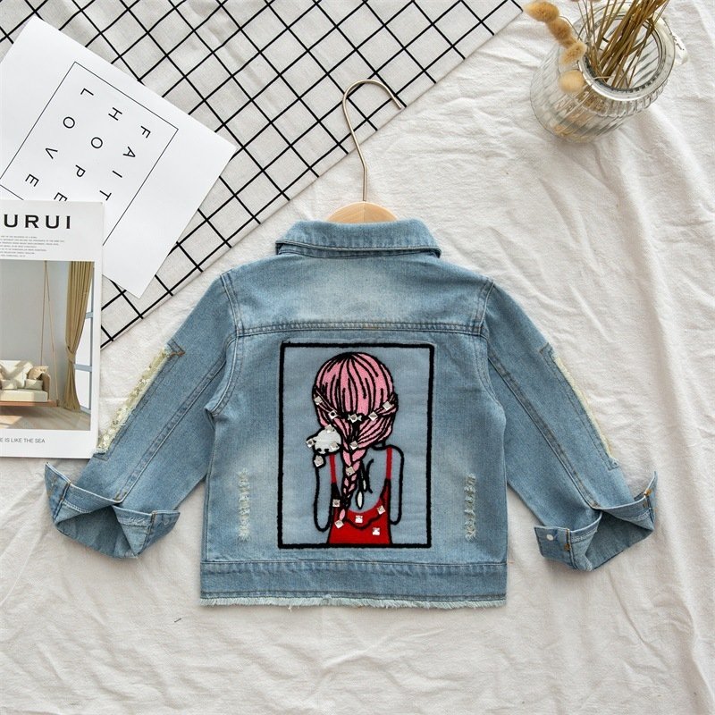 Kids Girls Casual Sequin Hole Denim Beauty Figure Girl Jacket Loose Single-breasted Denim Coat