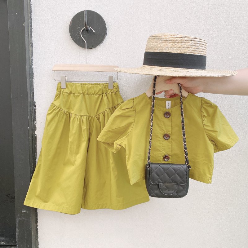 Kids Girls Casual Single-breasted Puff Sleeve Solid Color Top And Elastic Wide-leg Pants