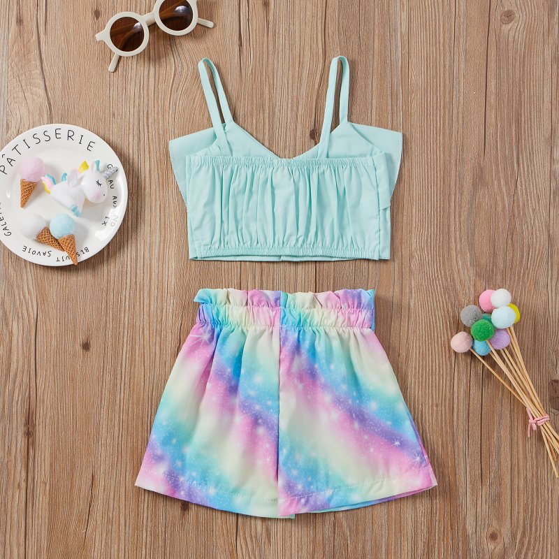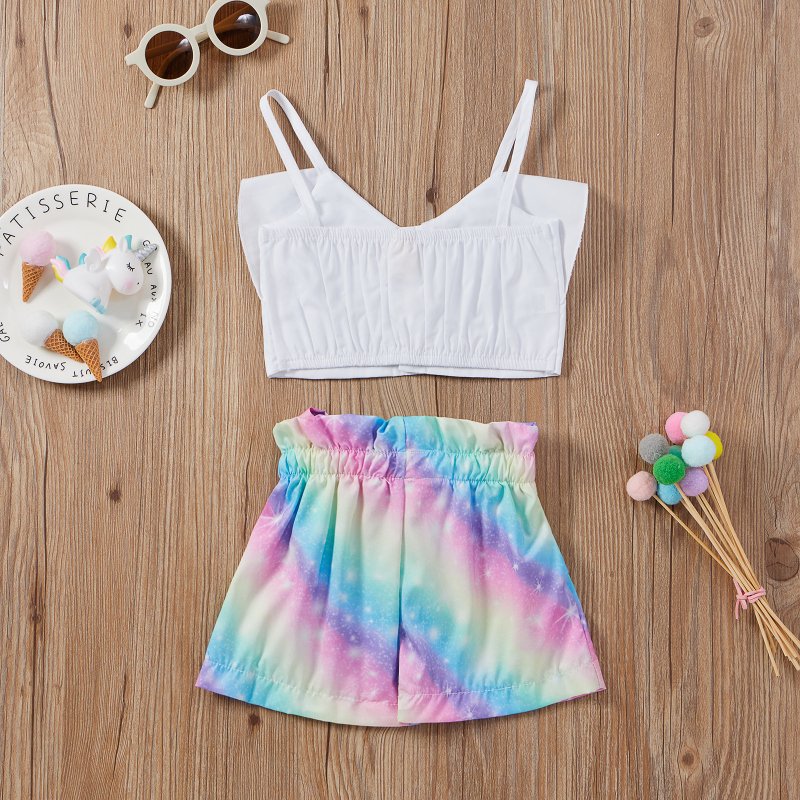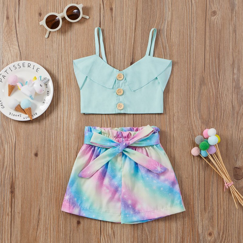 Kids Girls Casual Sleeveless Ruffled Vest Tops And Bowknot Tie-dye Shorts Set