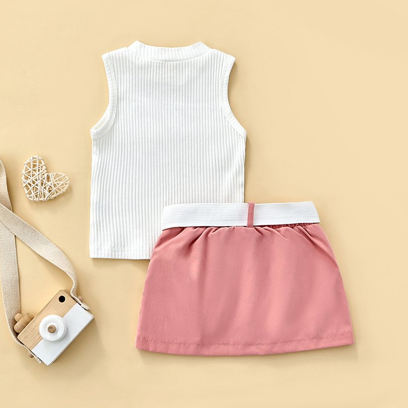 Kids Girls Casual Solid Color Sleeveless Tank Tops And Pocket Mini Skirt With Fanny Pack Set