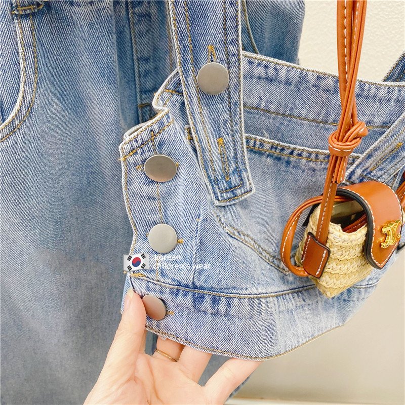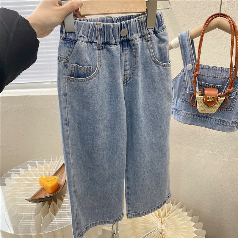 Kids Girls Casual Solid Color Sleeveless Top And Elastic Waist Denim Wide Leg Pants Set