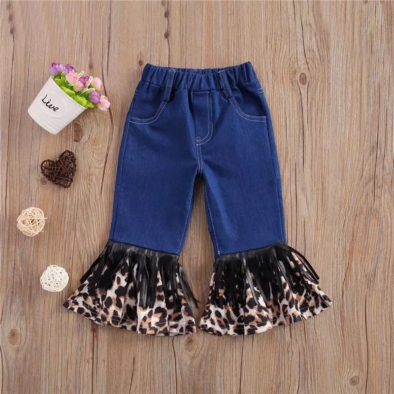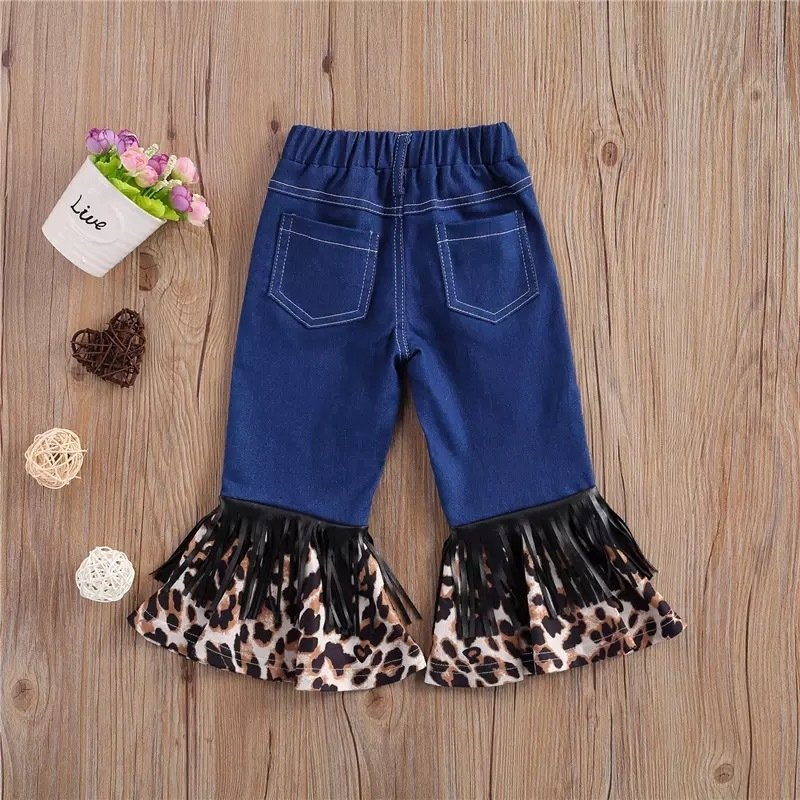 Kids Girls Casual Tassel Design Leopard Spliced Denim Flared Pants
