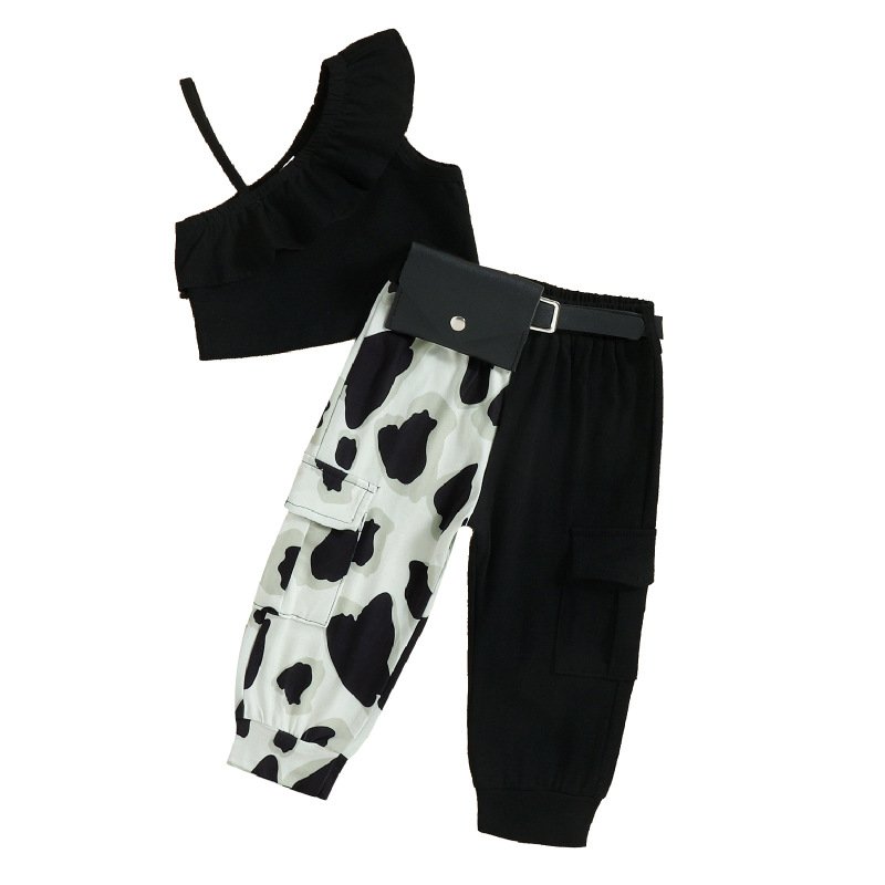 Kids Girls Creative Inclined Shoulder Design Ruffled Sleeveless Top And Color Blocking Cow With Waist Pack Set