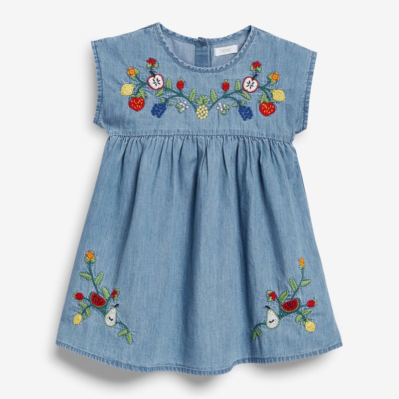 Kids Girls Cute Round Neck Short Sleeve Fruit Embroideried Denim Dress