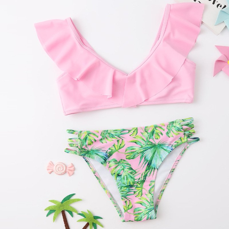 Kids Girls Cute Ruffled V Neck Top And Leaf Pattern Bottom Bikini Two-piece Set