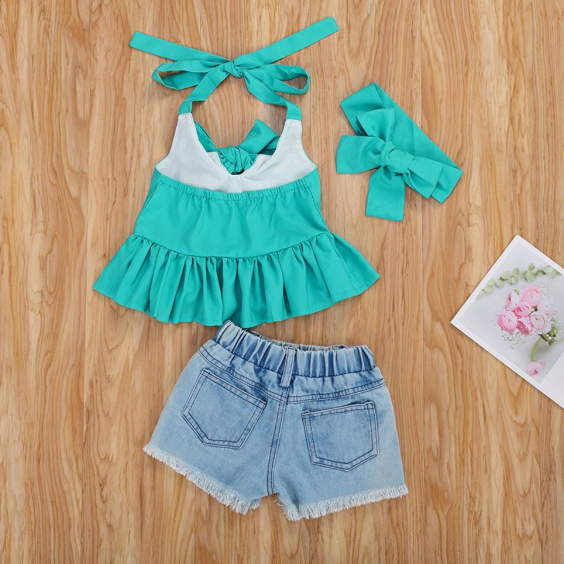 Kids Girls Cute Solid Color Bowknot Ruffled Sleeveless Vest Top And Denim Ripped Shorts With Headband Set