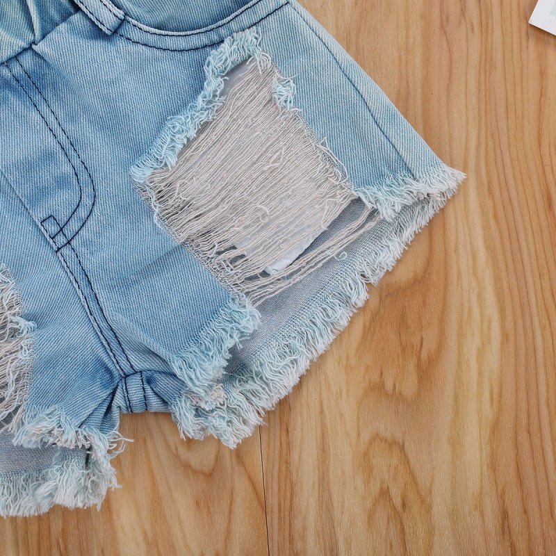 Kids Girls Cute Solid Color Bowknot Ruffled Sleeveless Vest Top And Denim Ripped Shorts With Headband Set