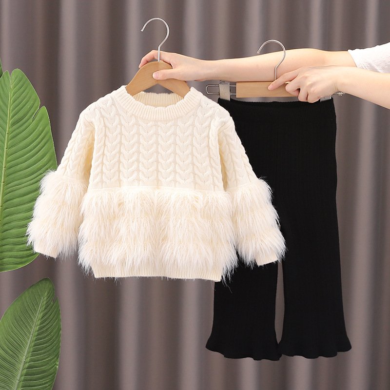 Kids Girls Fashion Autumn And Winter Knitted Plush Long-Sleeve Sweater Flared Pants Two-Piece Set
