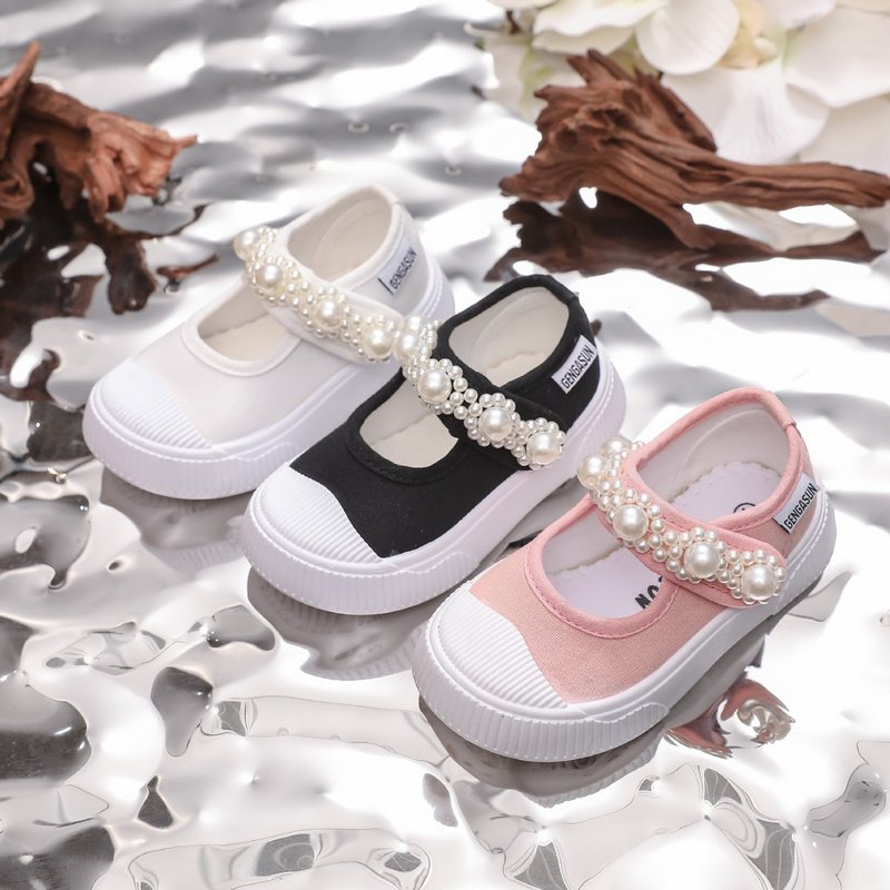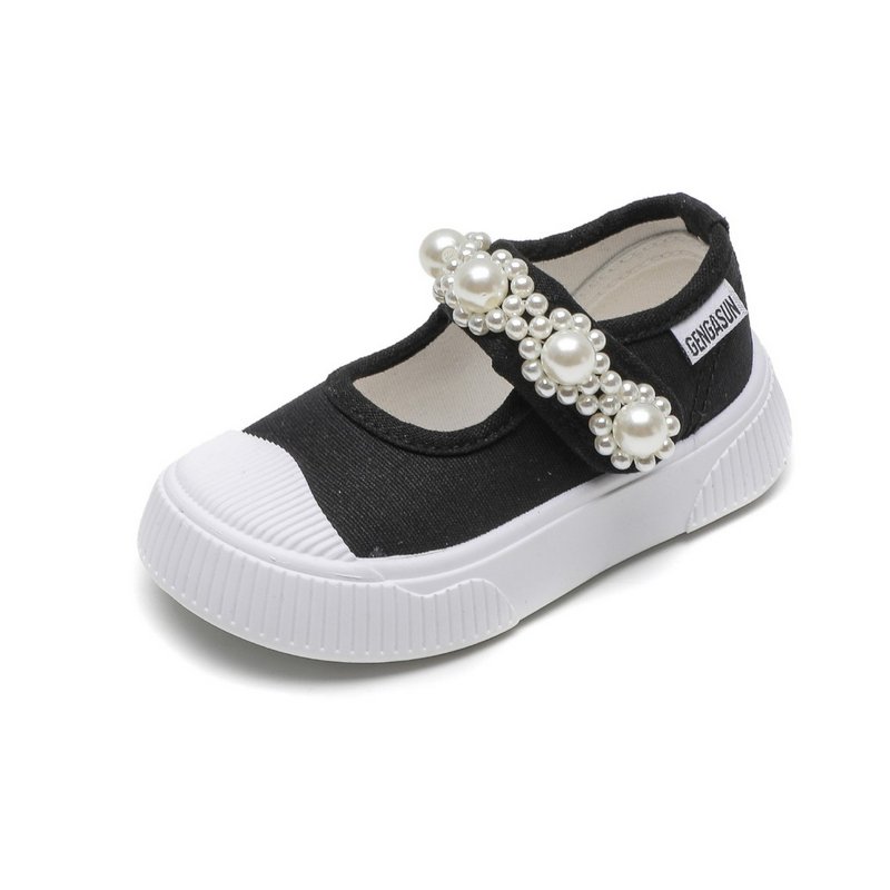 Kids Girls Fashion Casual Pearl Flat Thick-Soled Velcro Canvas Shoes