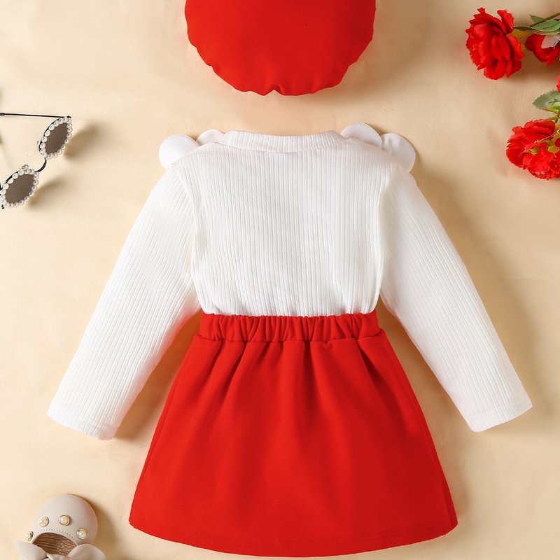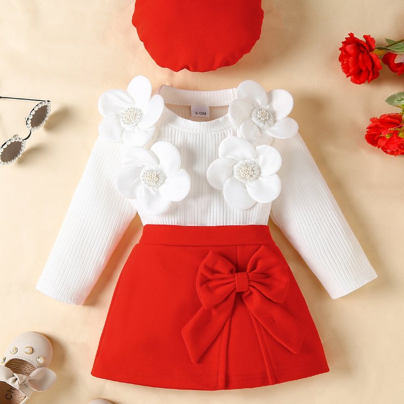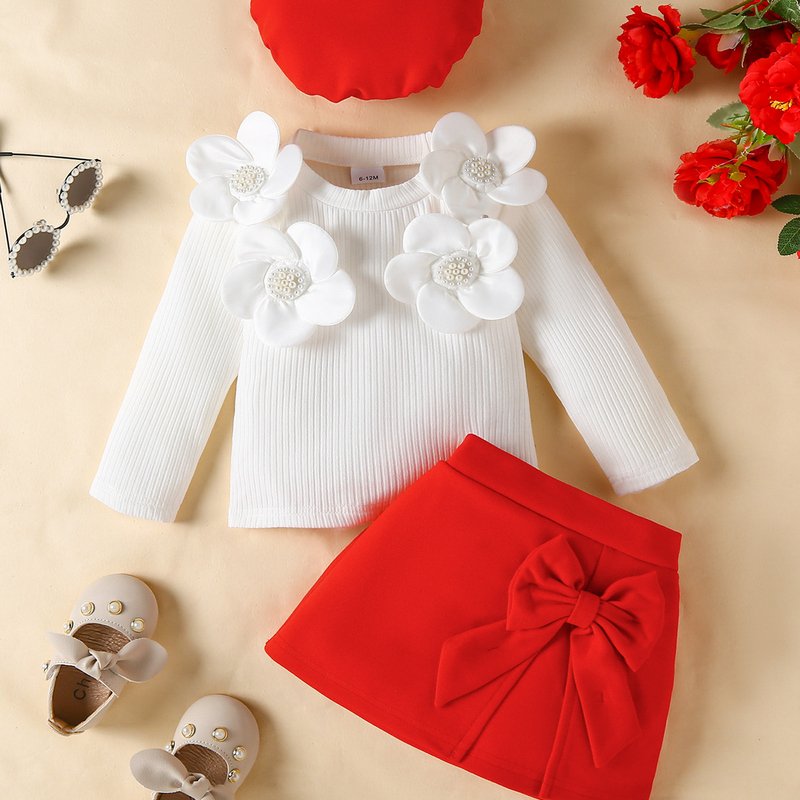 Kids Girls Fashion Cute Flower Decoration Long-Sleeve Top Bowknot Skirts Two-Piece Set