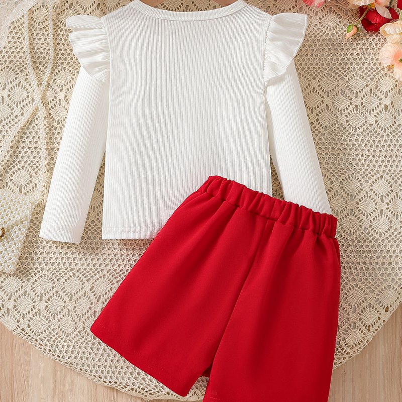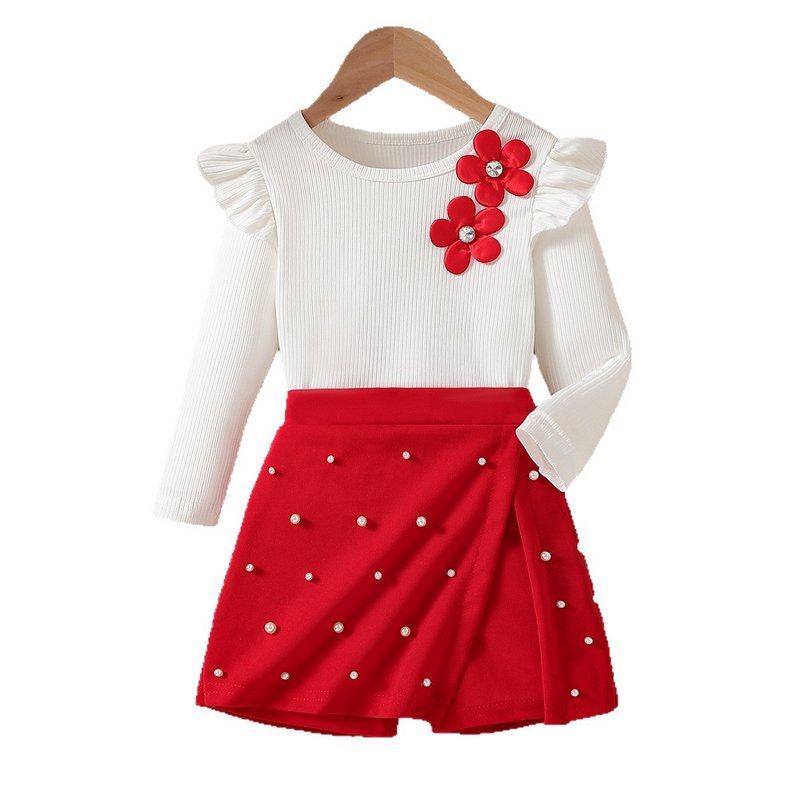 Kids Girls Fashion Elegant Autumn Flower Decoration Long-Sleeve Top Pearl Shorts Two-Piece Set