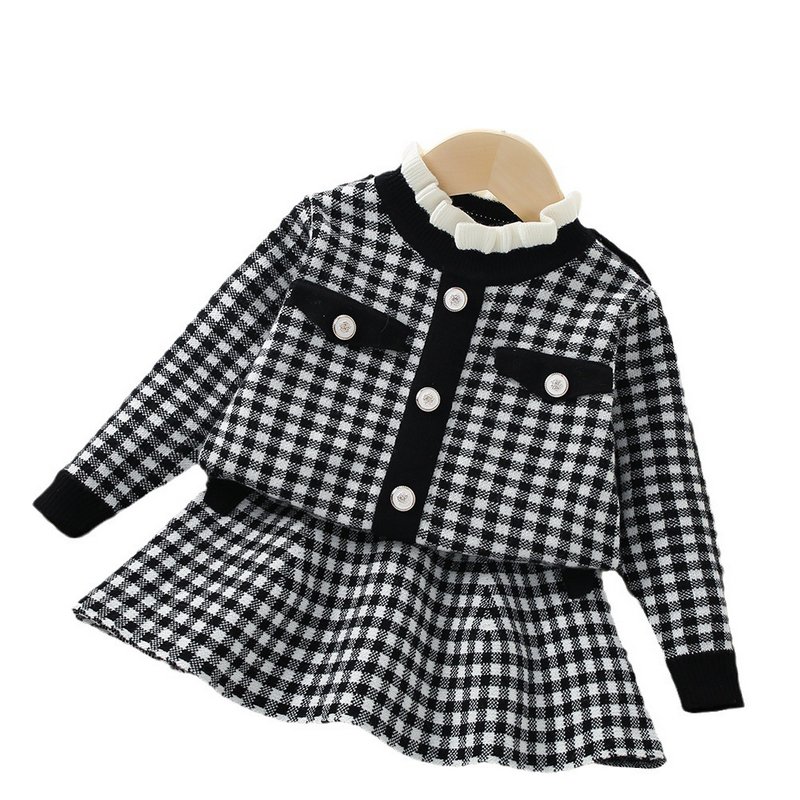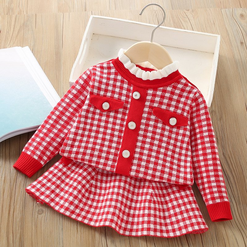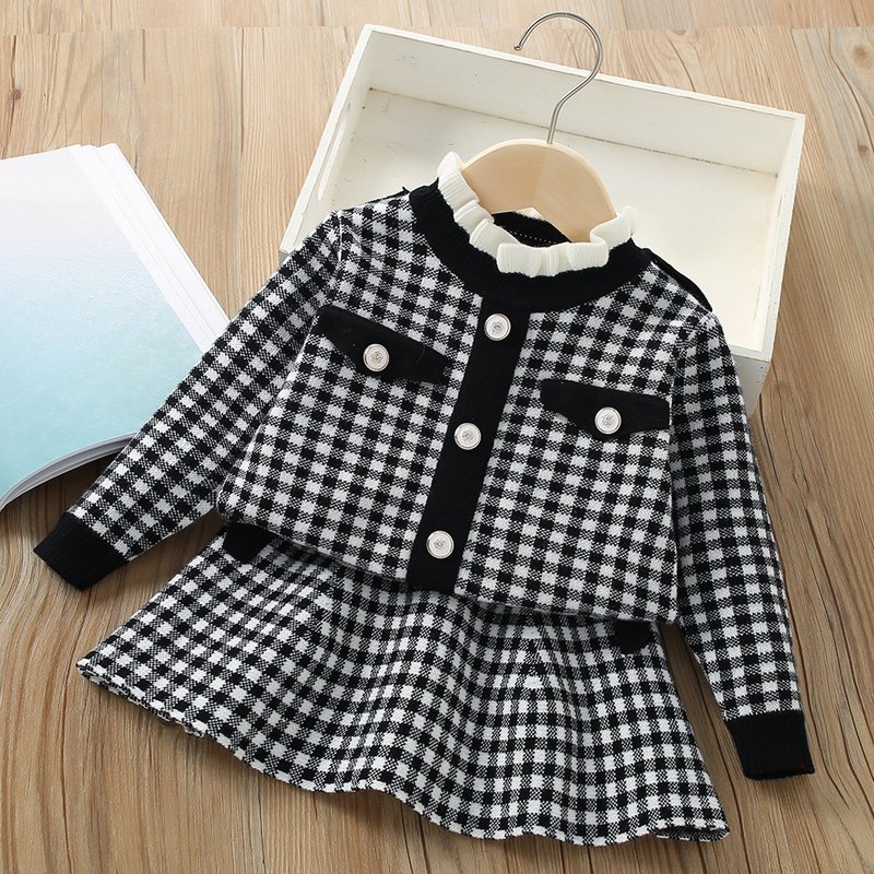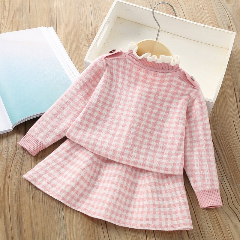 Kids Girls Fashion Elegant Knitted Plaid Long-Sleeve Sweater Skirts Two-Piece Set