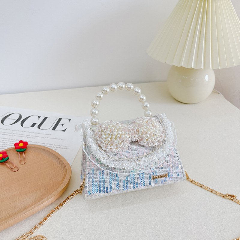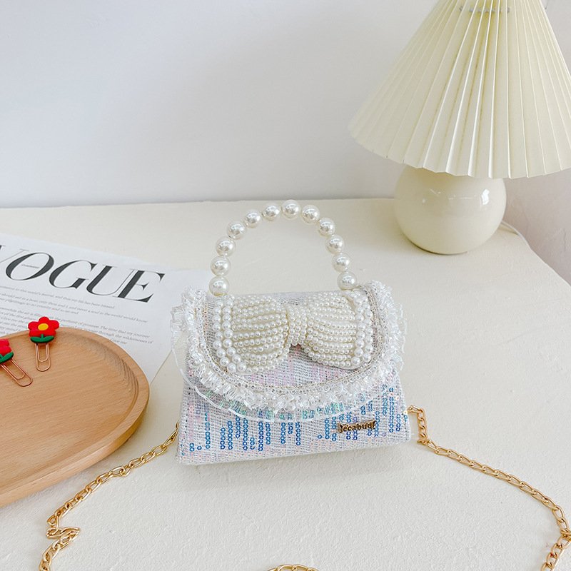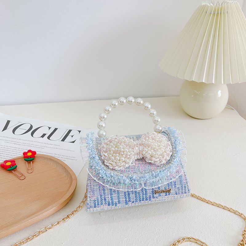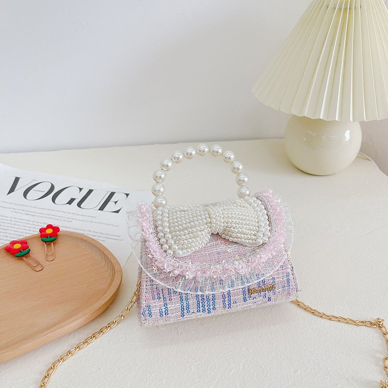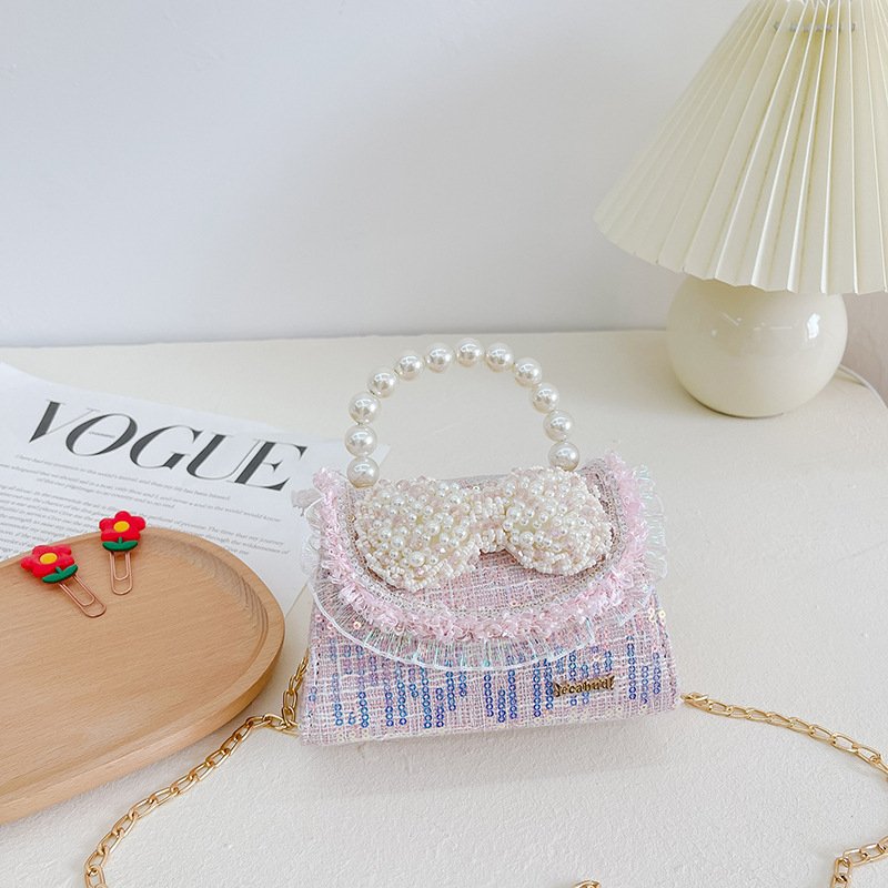 Kids Girls Fashion Sweet Cute Color-Matching Pearl Sequins Bow Mini Square Handle Crossbody Bag