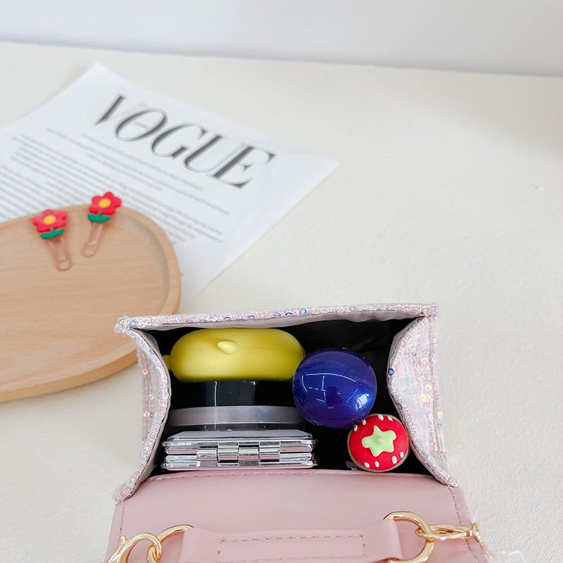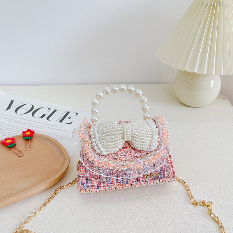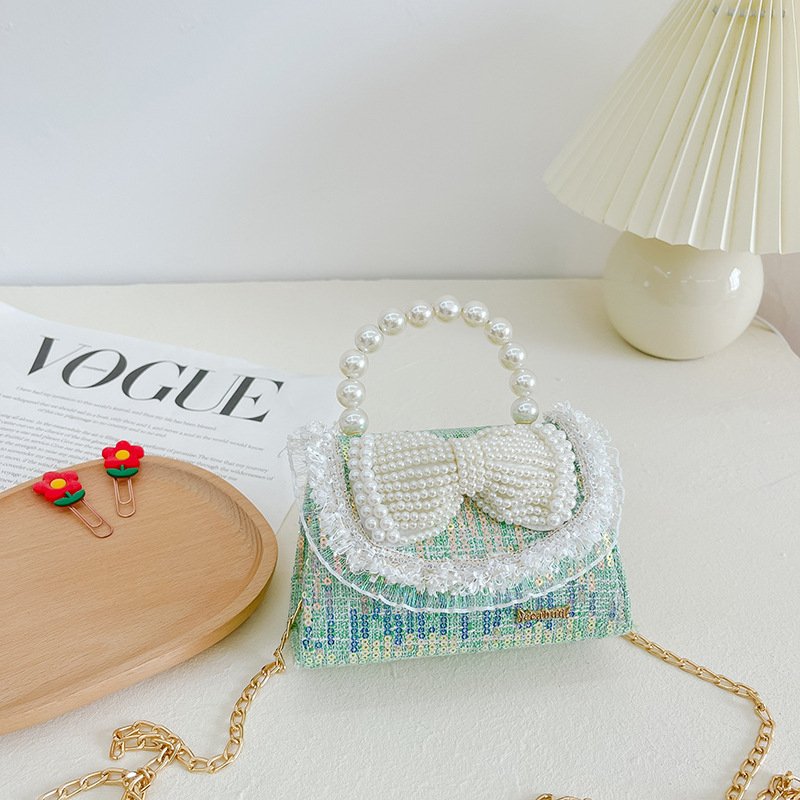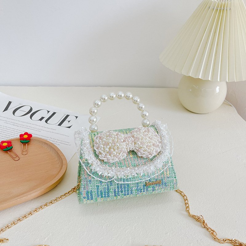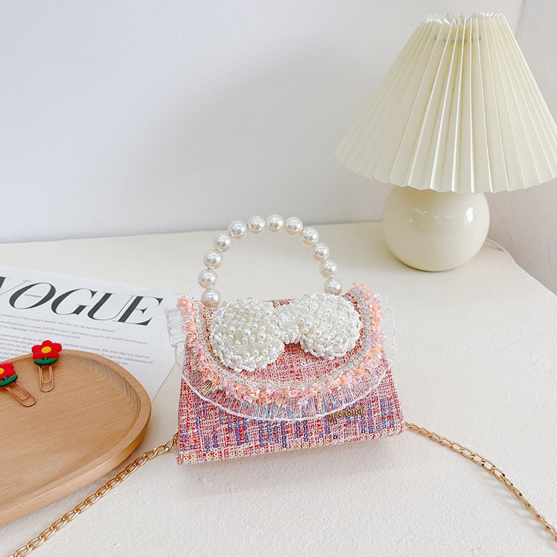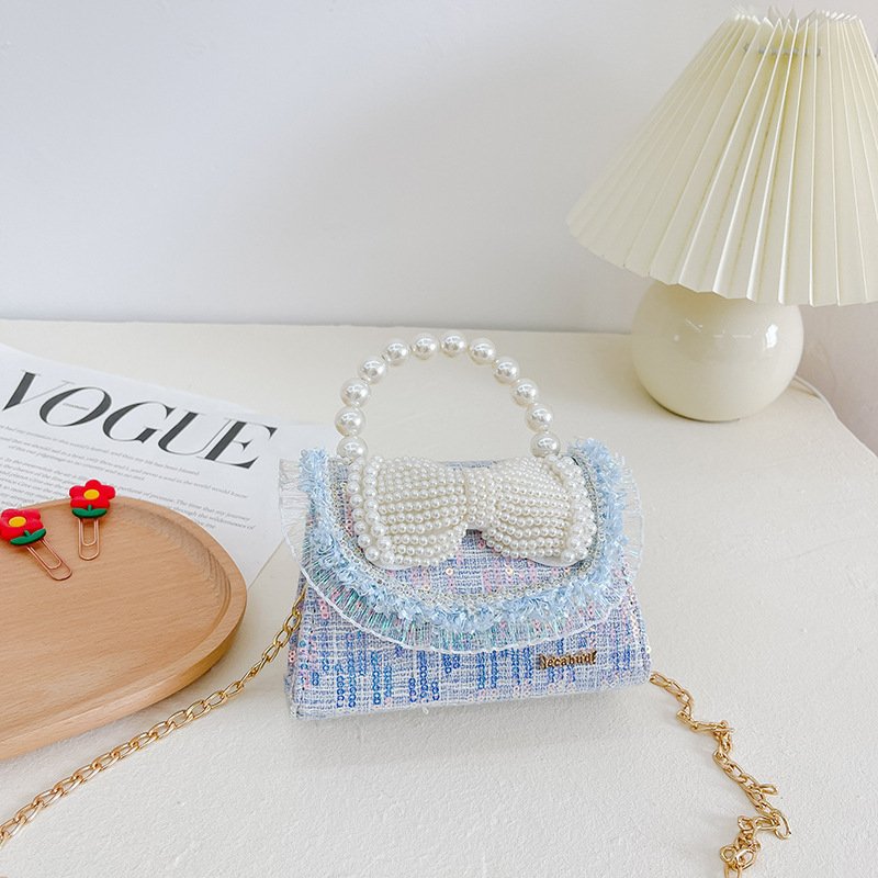 Kids Girls Fashion Sweet Cute Color-Matching Pearl Sequins Bow Mini Square Handle Crossbody Bag