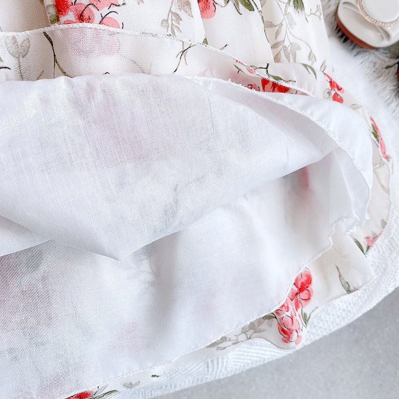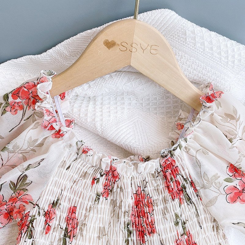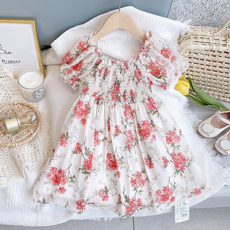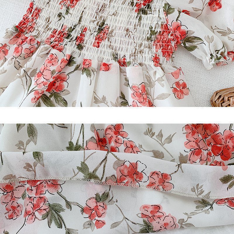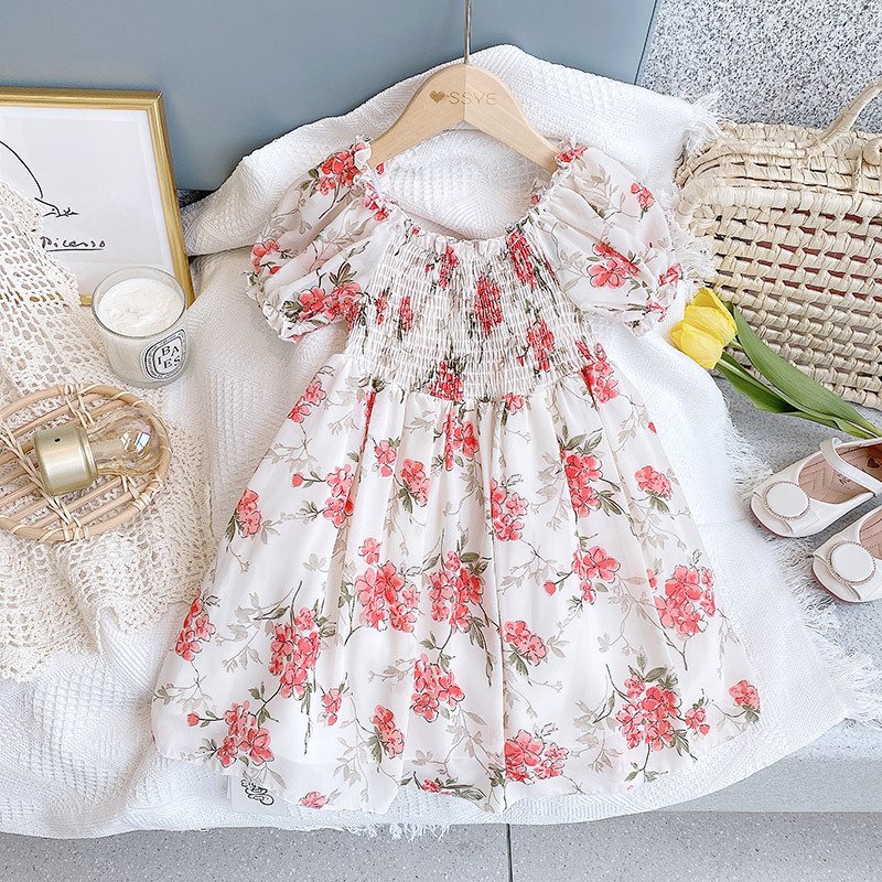 Kids Girls Pastoral Flower All Over Print Puff Sleeves Elastic Pleated Dress
