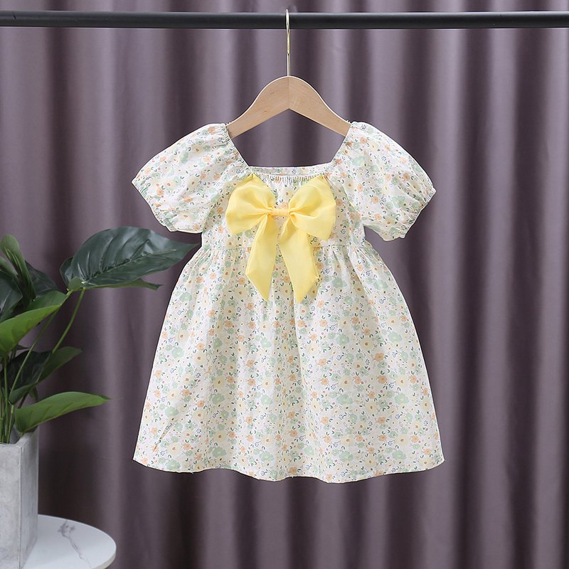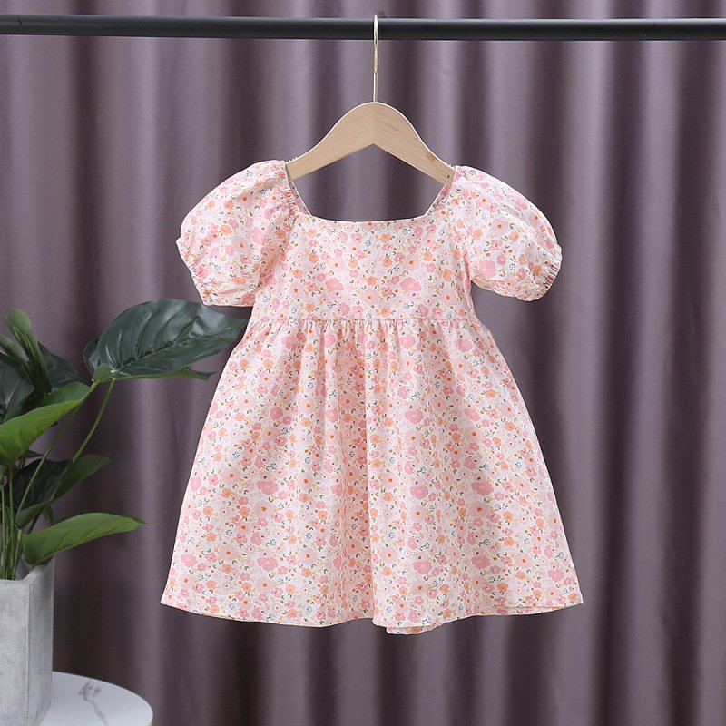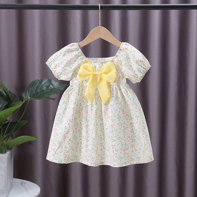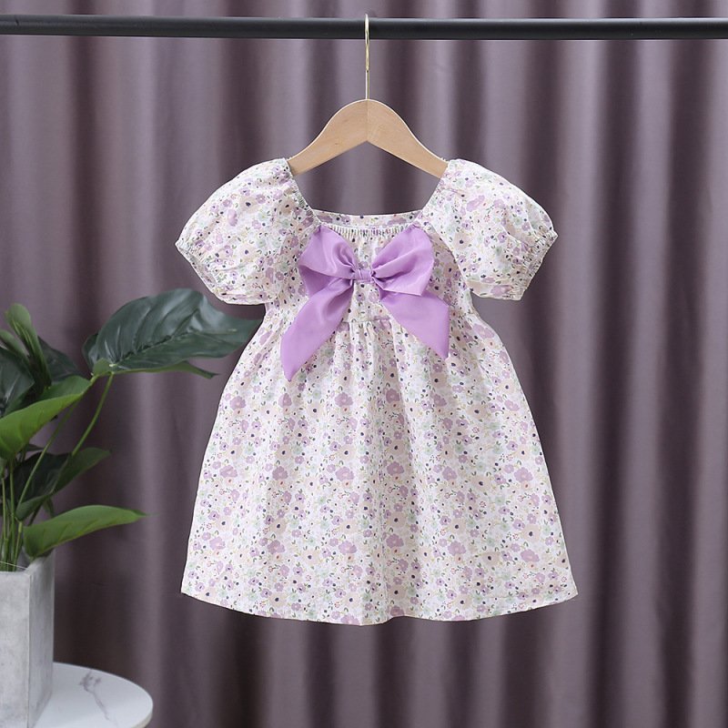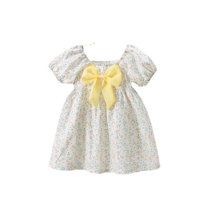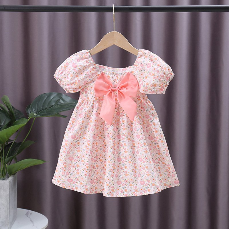 Kids Girls Pastoral Square Neck Elastic Puff Sleeve Floral All Over Print Bow Design Dress