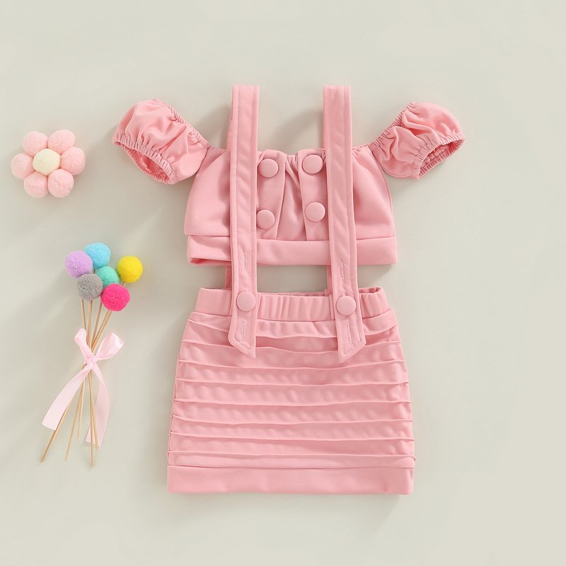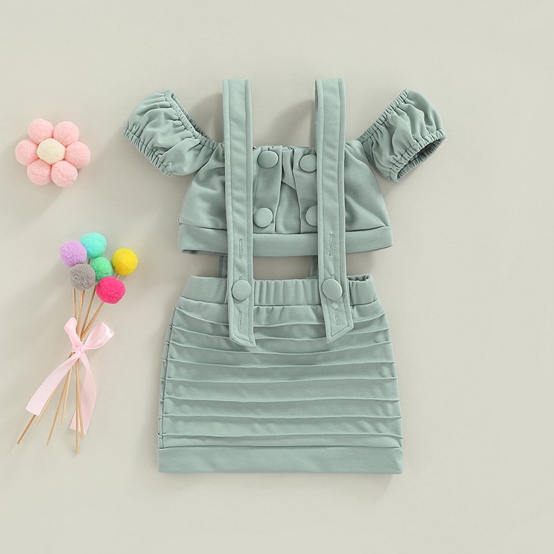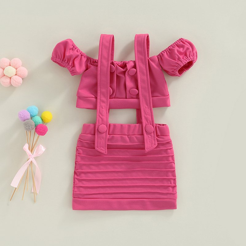 Kids Girls Personalized Solid Color Short Sleeve Cool-shoulder Top And Suspender Skirt Set