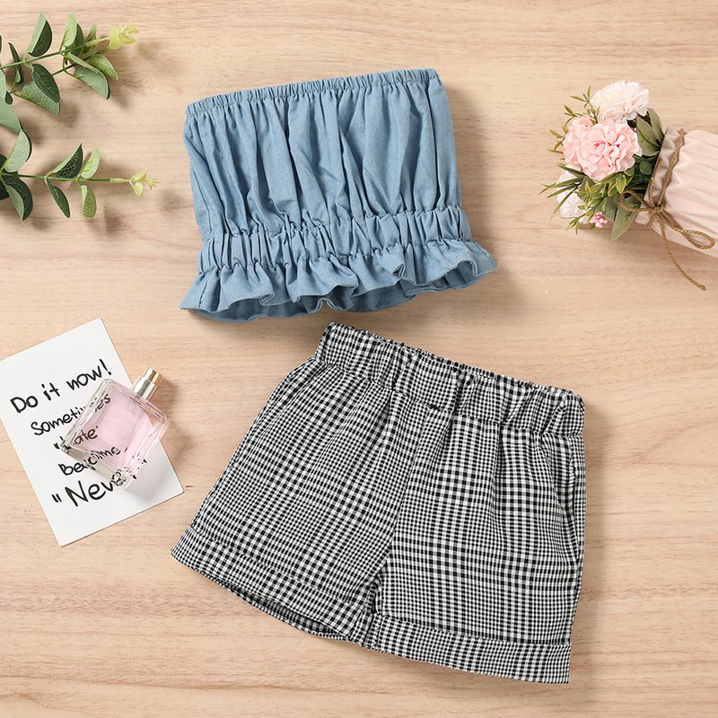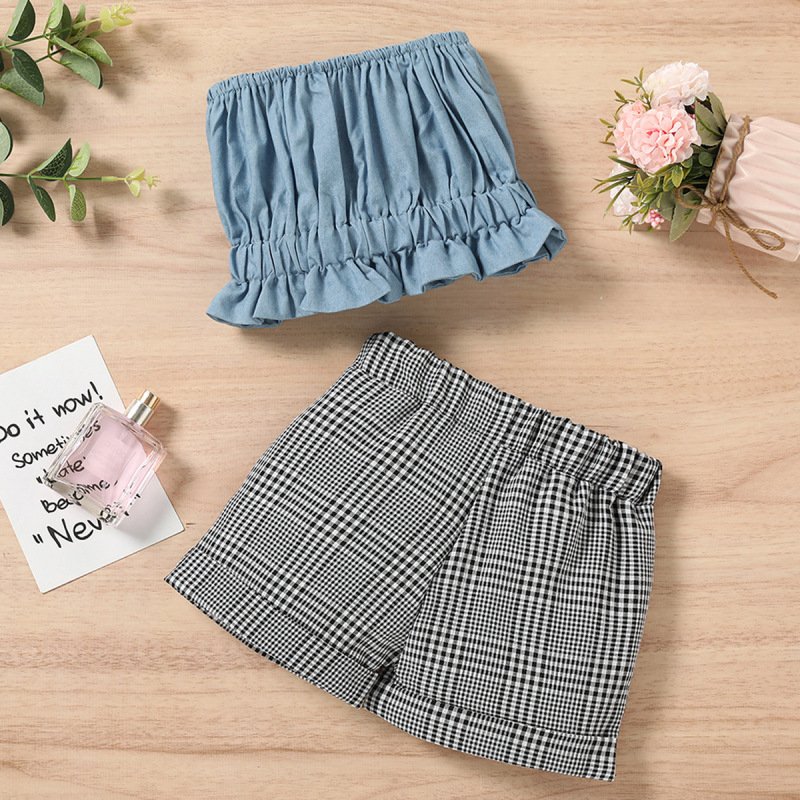 Kids Girls Solid Color Sleeveless Fold Design Tube Top And Plaid Shorts Set