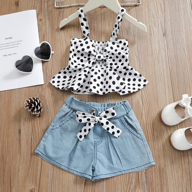 Kids Girls Sweet Polka Dot Bow Design Ruffled Camisole And Elastic Denim Shorts Set