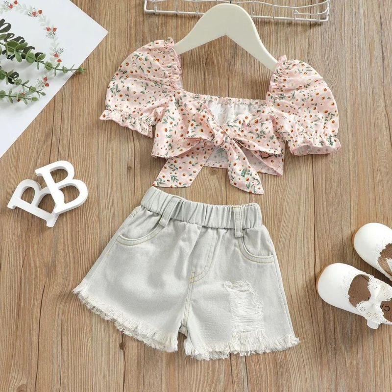 Kids Girls Sweet Short Puff Sleeve Floral All Over Print Knotted Top And Elastic Waist Ripped Denim Shorts Set