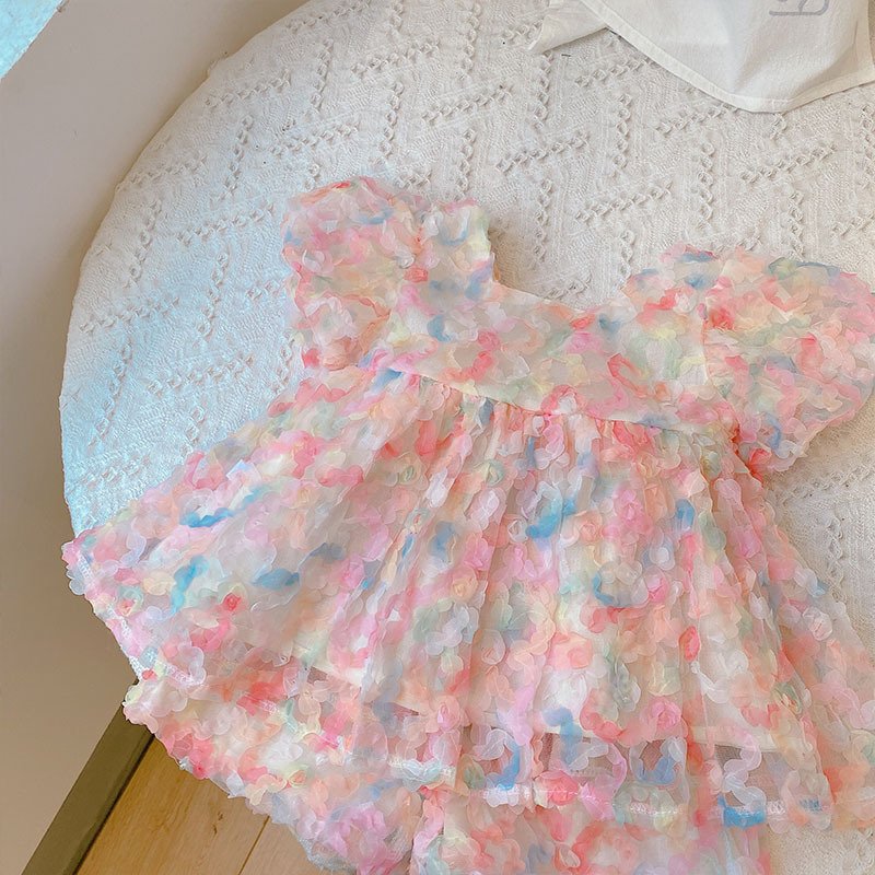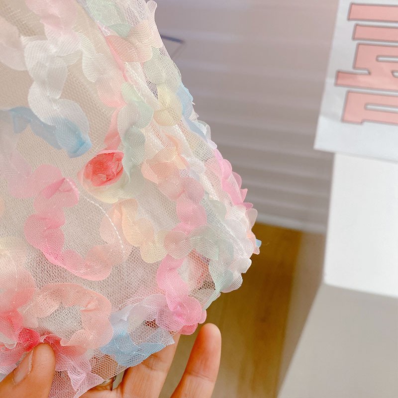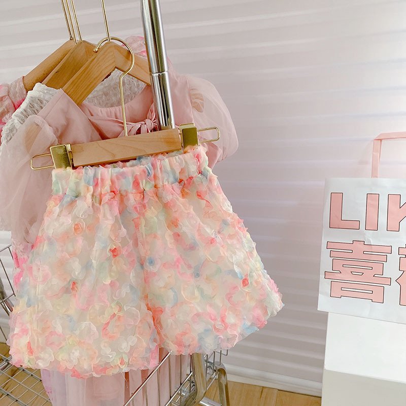Kids Girls Sweet Square Neck Puff Sleeve 3D Flower Top And Shorts Two-piece Set