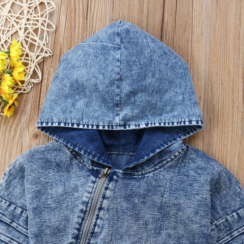 Kids Long-sleeves Zipper Design Hooded Denim Jumpsuit