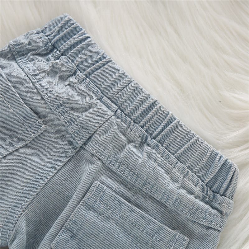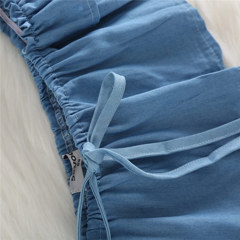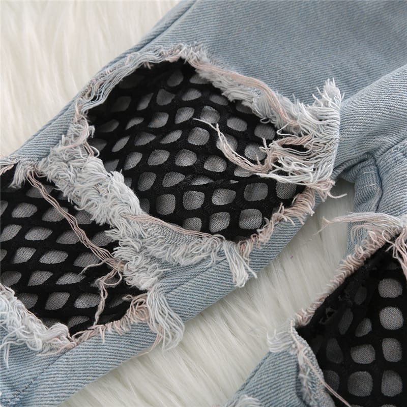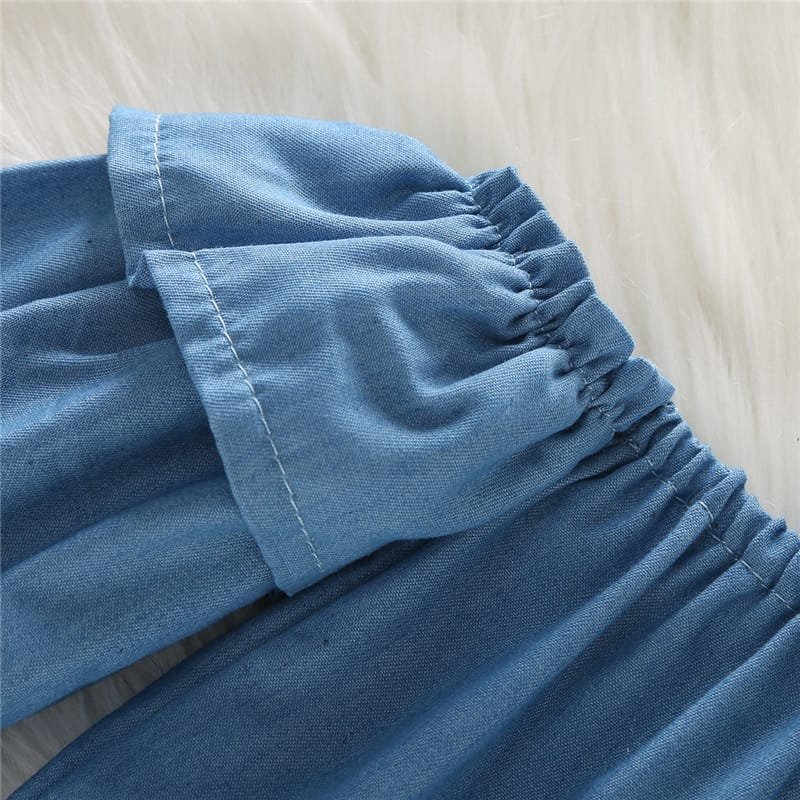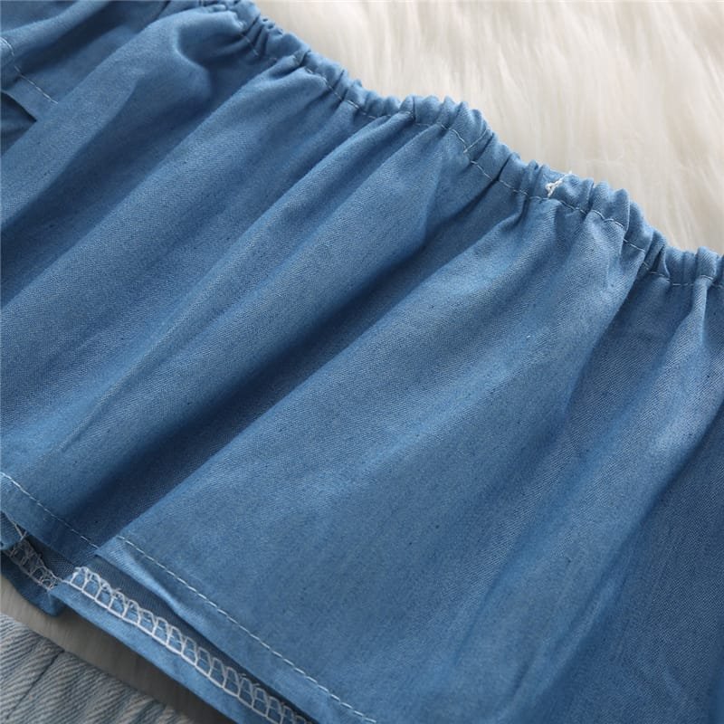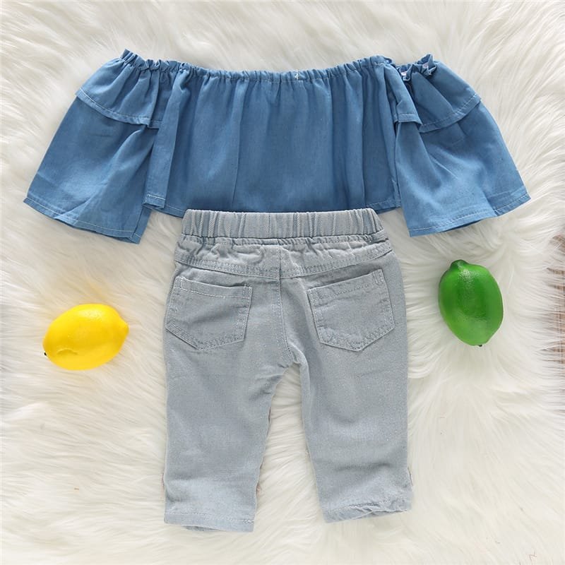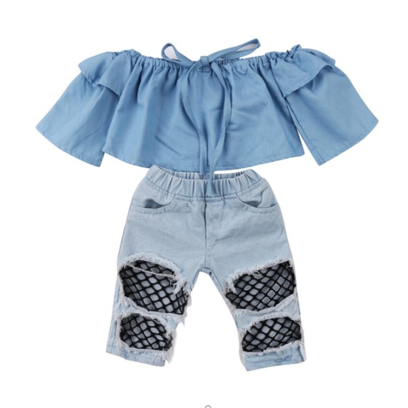 Kids Off-the-shoulder Denim Top And Hole Fishnet Design Jeans Suit