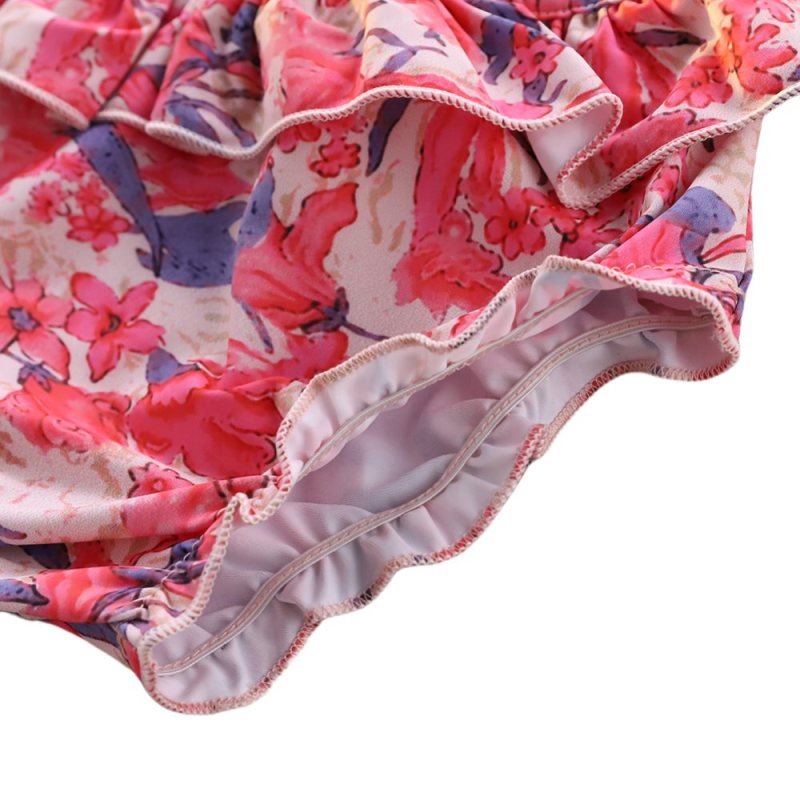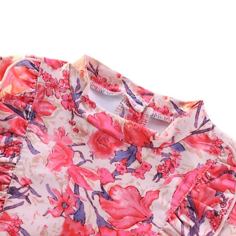 Kids Sweet Floral All Over Print Long Sleeve Ruffled Top And Elastic Bottom Swimwear Two Pieces Set