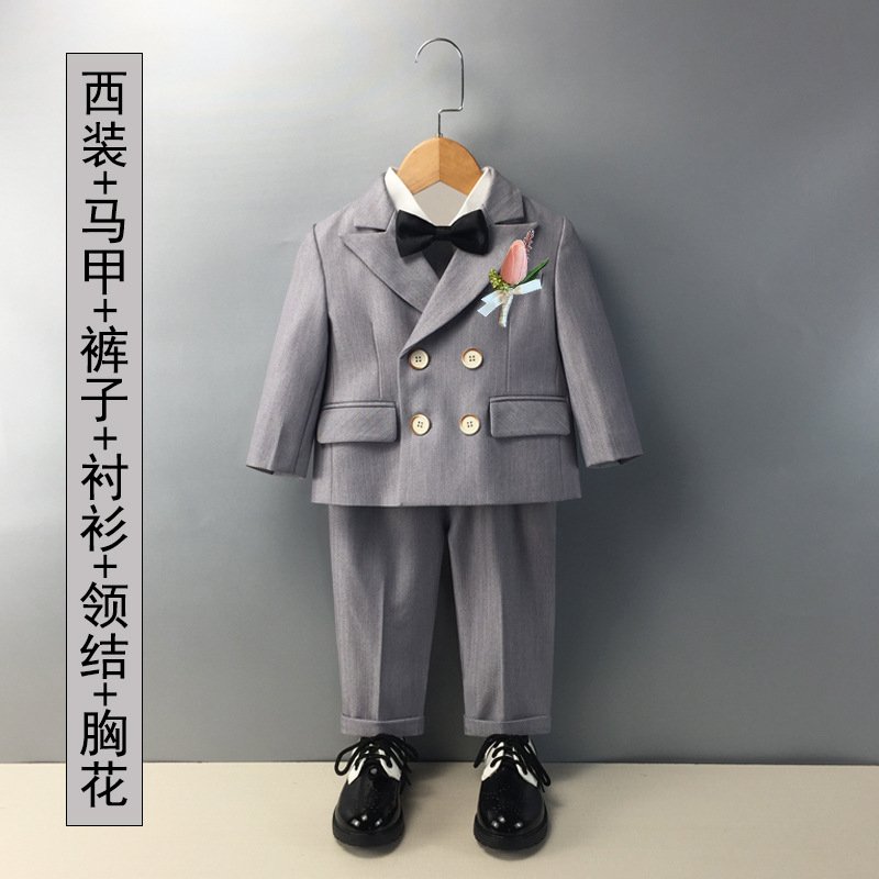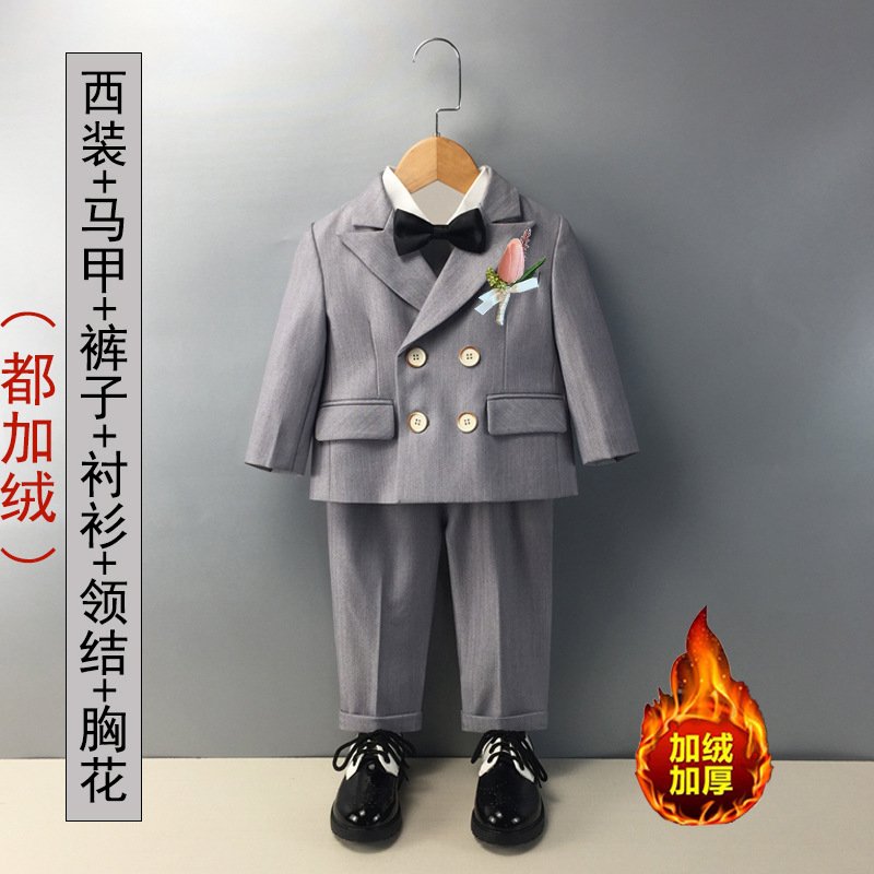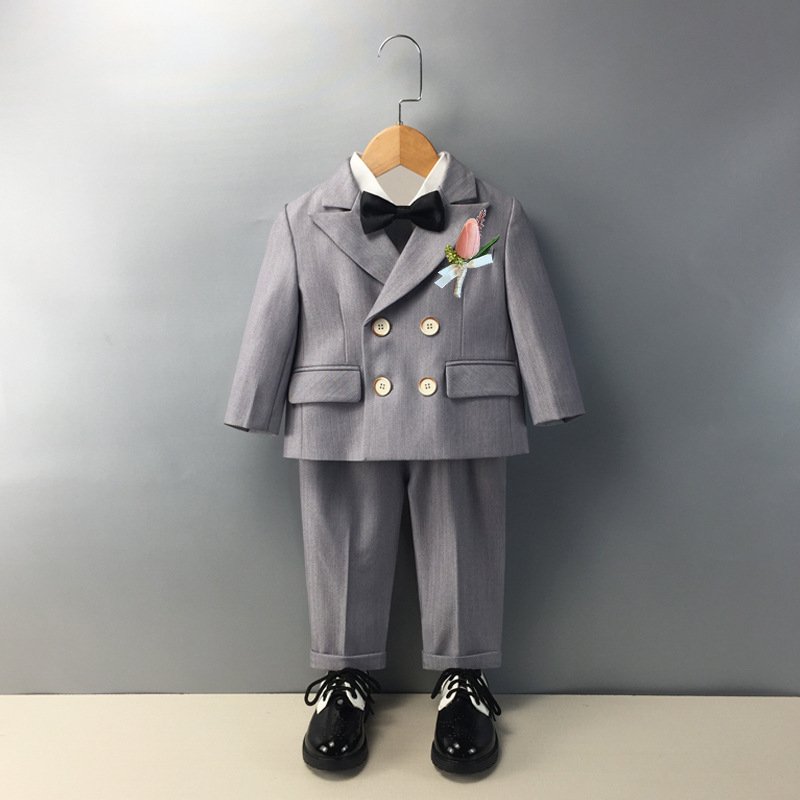 • (Full Set Plus Velvet) Grey (Suit Waistcoat Pants Shirt Black Bow Tie Tulip Pink Corsage) – 4Y (120)